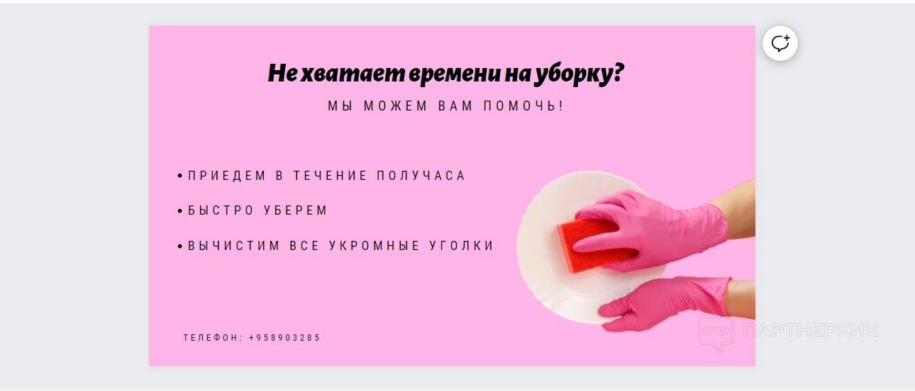 Шаг №2 : после настройки размера нужно сделать привлекательный фон для креатива — так как это клининговая компания, то цвета должны ассоциироваться с чистотой и уютом. Поэтому используем базовый розовый — он вызывает ощущение уюта и удовлетворения.