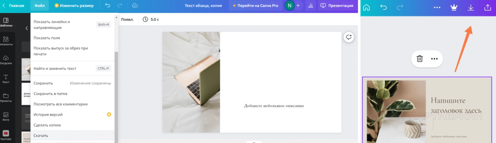 По окончании работы над проектом, его можно без проблем скачать. Для этого нужно на панели вверху нажать на надпись «Файл» на десктопе или в вебе или тапнуть по стрелочке в мобильном приложении.