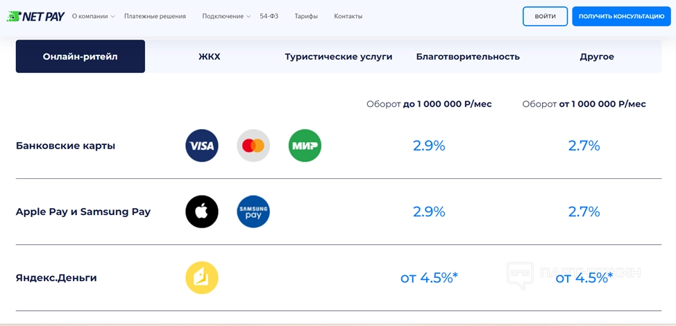 Внимание! У следующих платежных систем комиссия рассчитывается индивидуально, в зависимости от категорий реализуемых товаров/услуг и оборота принимаемых платежей: ApplePay, SamsungPay, Яндекс.Деньги, WebMoney, QIWI.