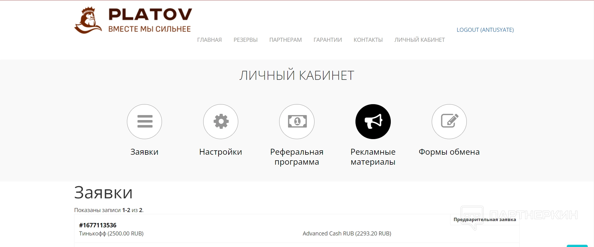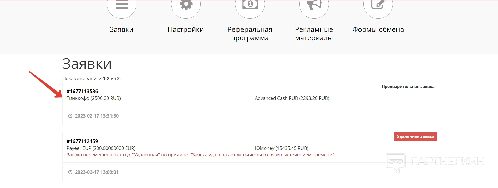 - заявки — здесь можно изучить всю историю по заявкам пользователя. В списке отображаются действующие, те, которые были исполнены, а также те, которые отменились из-за неуплаты. Управлять ими не получится — только просматривать список: номер заявки, условия, а также дату и время;