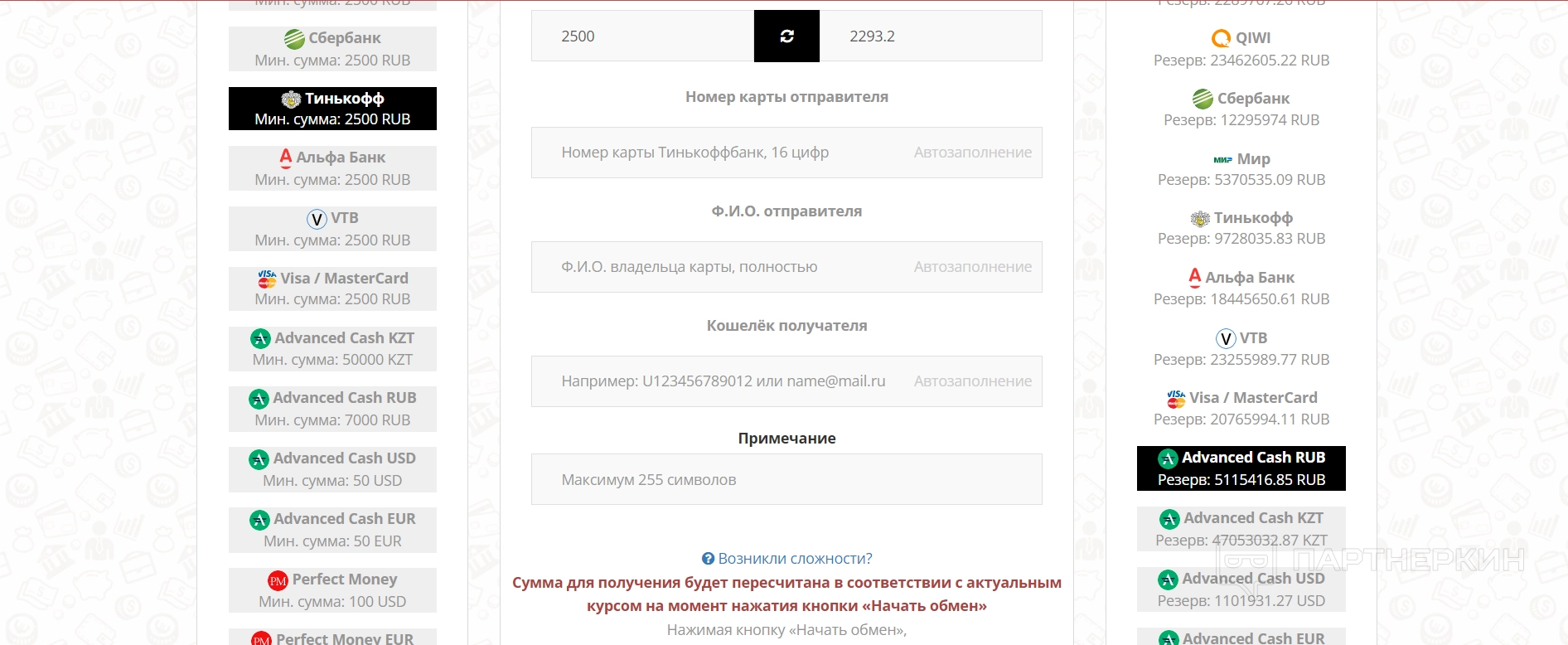 Тут можно найти подробное описание сум, которые доступны — то есть пользователь не может обменять свыше указанного резерва. Давайте кратко обозначим, для каких платформ, с которых будут выводится средства, показываются резервы: