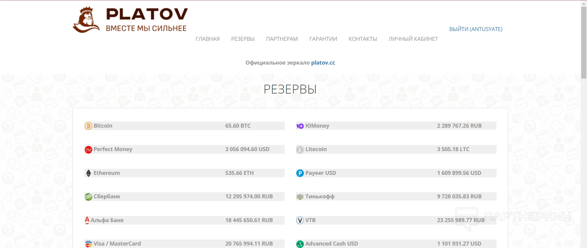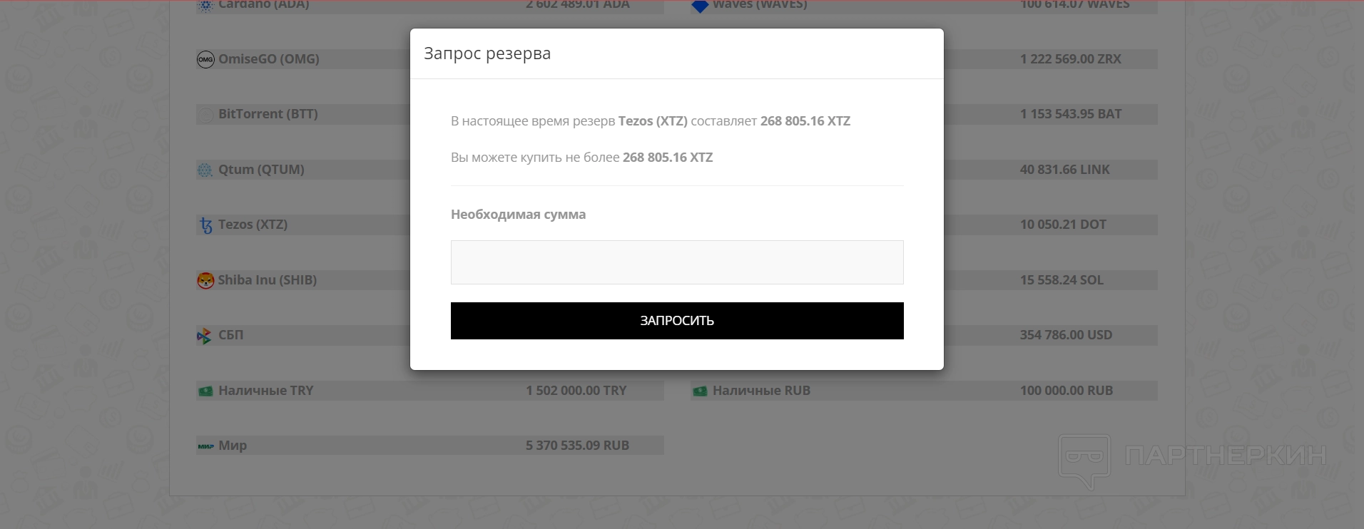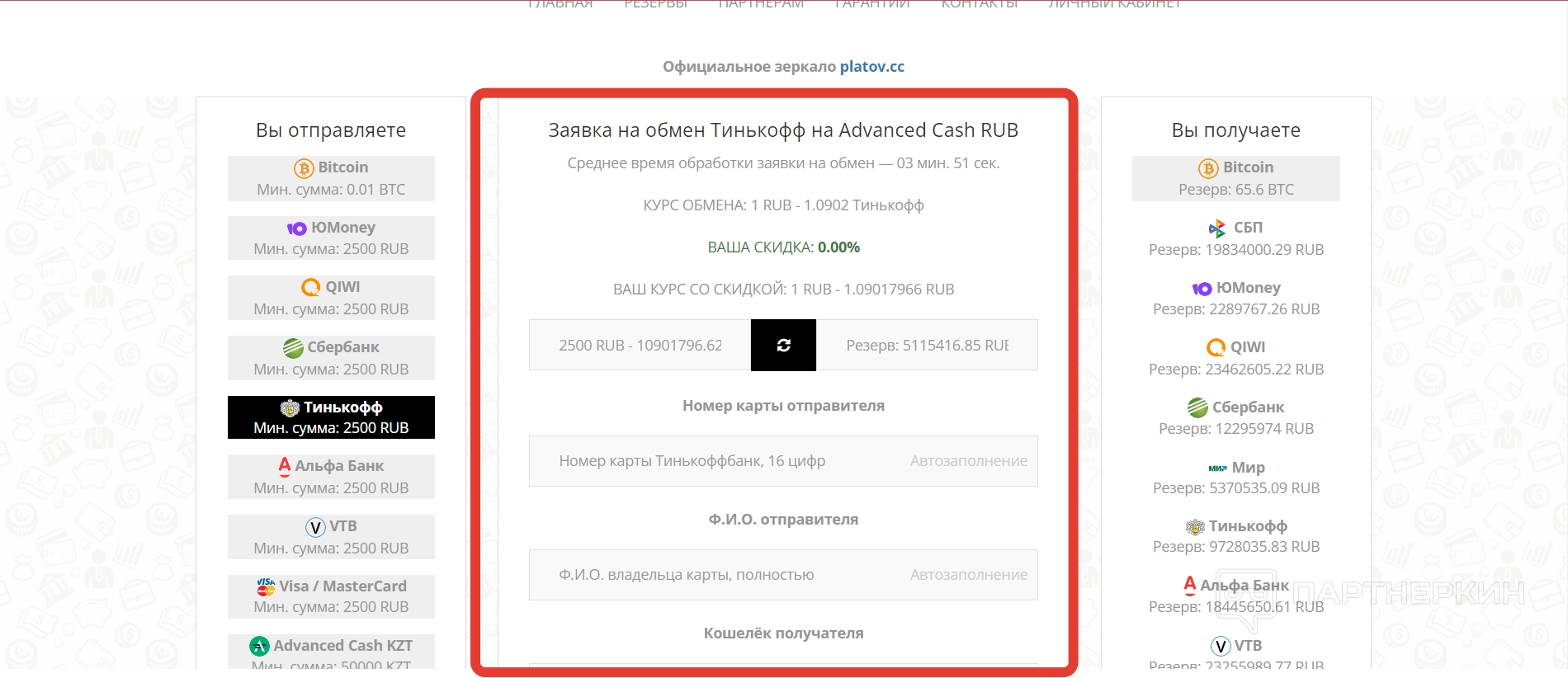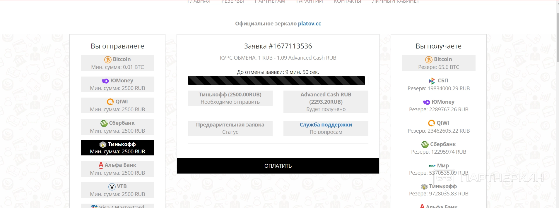 Резервы — в этом разделе пользователи могут посмотреть все доступные резервы по различным валютам и платформам, с которых производится перевод средств.