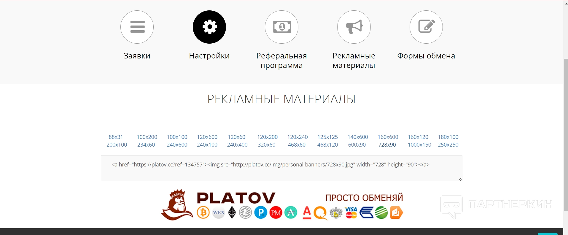 - рекламные материалы — в этом подразделе показывается логотип сервиса в разных вариациях и размерах, а также указывается его код на странице;