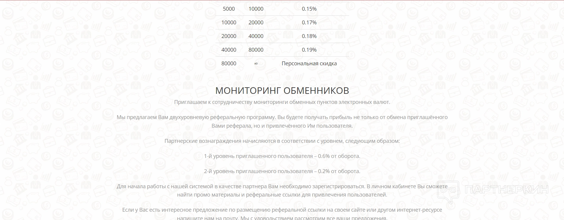 Ниже уже рассказывается о партнерской программе — об условиях и проценте, который получает партнер с оборота. В случае приглашения одного реферала процент будет составлять 0,6% от оборота, а если приглашенный реферал также пригласит еще одного пользователя, то участник получит уже 0,2% от оборота. То есть партнерская программа здесь двухуровневая.