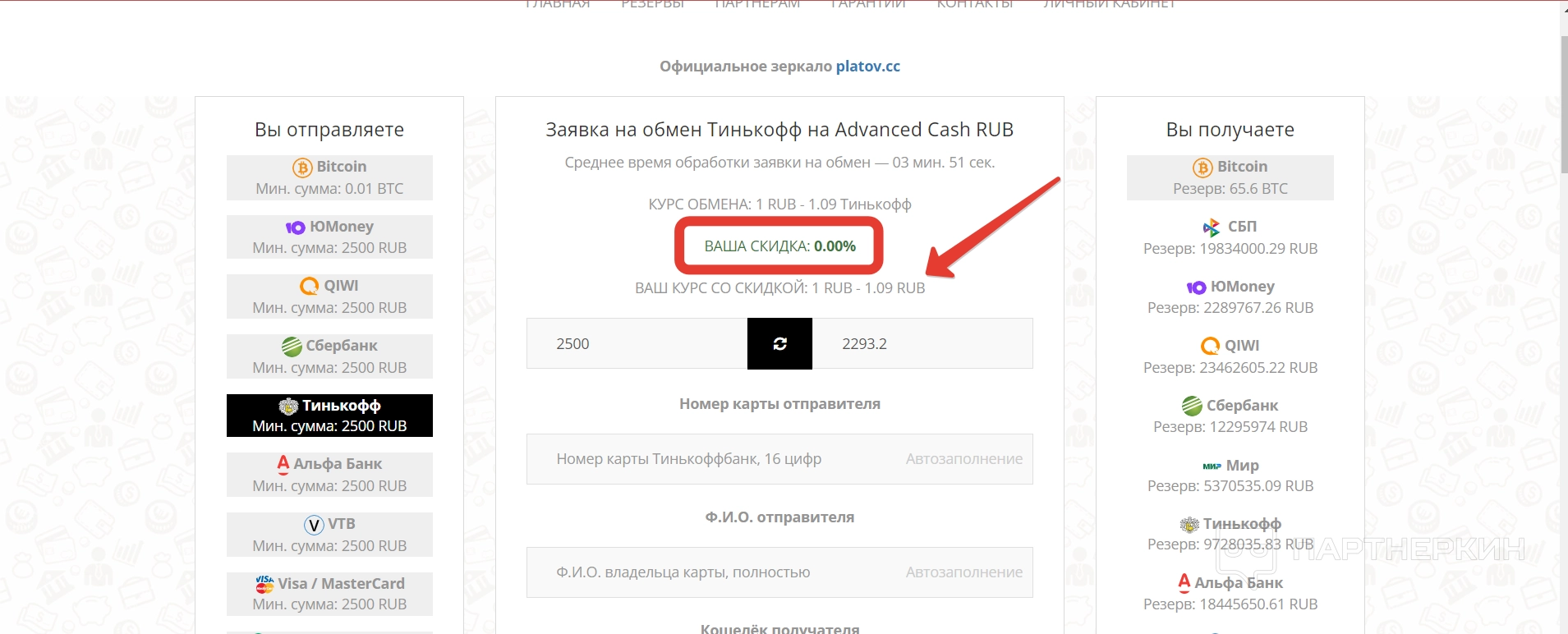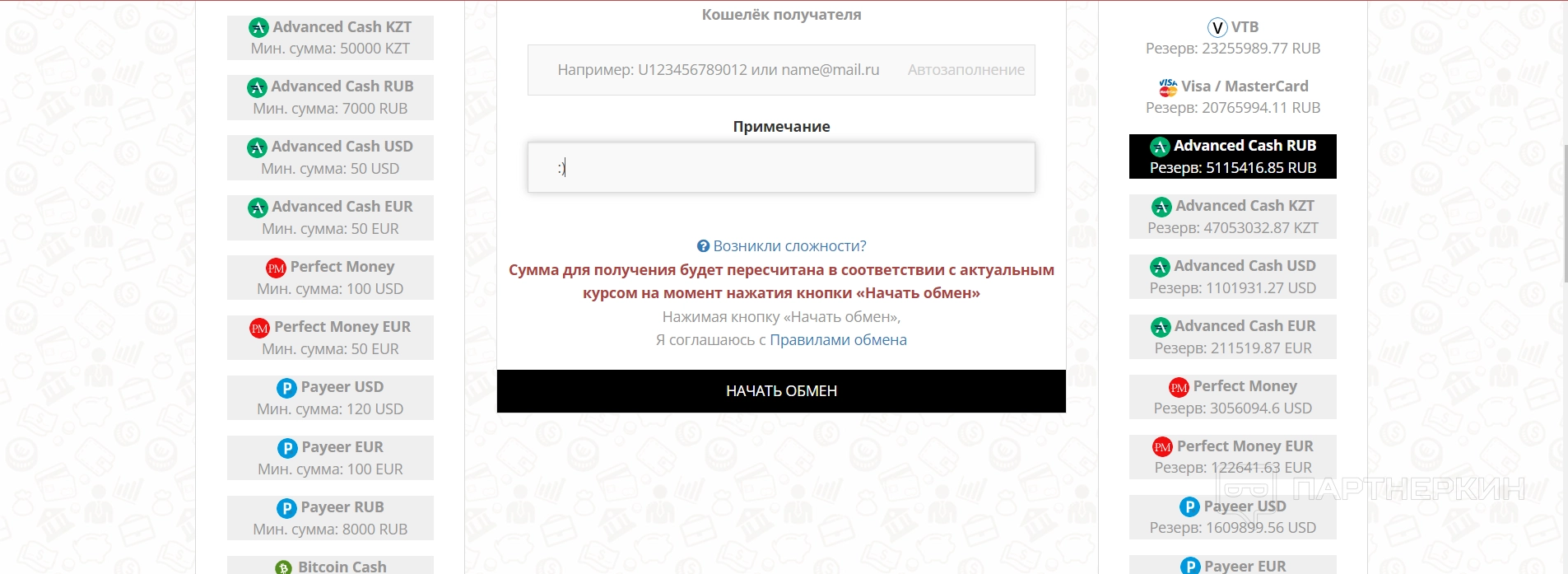 | Есть своя система накопительных скидок — при обмене определенных сумм пользователи могут накапливать проценты, которые идут в расчет скидки по курсу. Чем больше и чаще будет обменивать пользователь, тем выше его скидка будет в итоге. Сравнительная таблица есть на сайте — в разделе «Партнерам» | Некоторые разделы иногда слетают — во время обзора проблем с функционалом разделов не было, за исключением страницы с часто задаваемыми вопросами, так как она просто не открывалась. В отзывах пользователи иногда пишут, что разделы или отдельные страницы не открываются. Также в целях безопасности система постоянно проверяет подключение пользователя, и приходится тратить время на проверку |