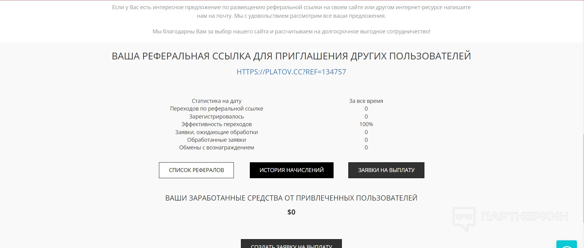 - реферальная программа — тут пользователи могут также изучить подробные условия работы по реферальной программе сервиса. Также здесь расположена реферальная ссылка, по которой можно приглашать пользователей. Если нужно вывести средства, то это делается также через этот раздел — для этого нужно создать заявку на вывод средств. В подразделе также находится история всех начислений;