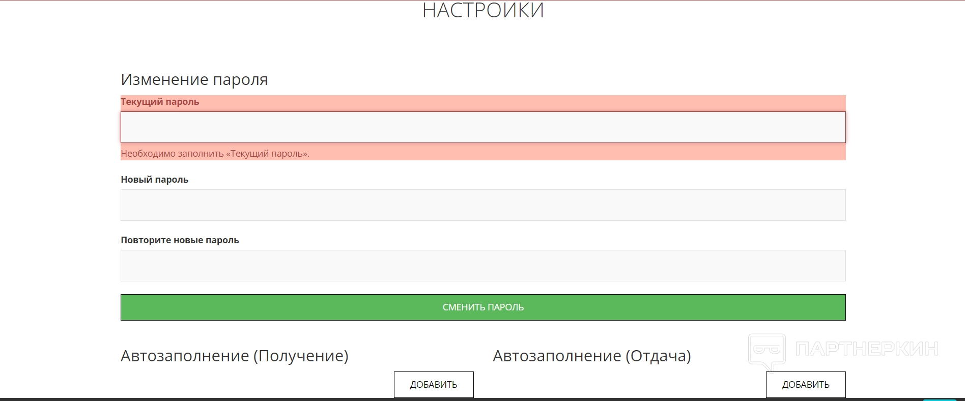 - настройки — в этом подразделе пользователи могут изменить старый пароль на новый. Для этого достаточно указать текущий пароль и ввести новый. Можно по желанию активировать функцию автозаполнения;