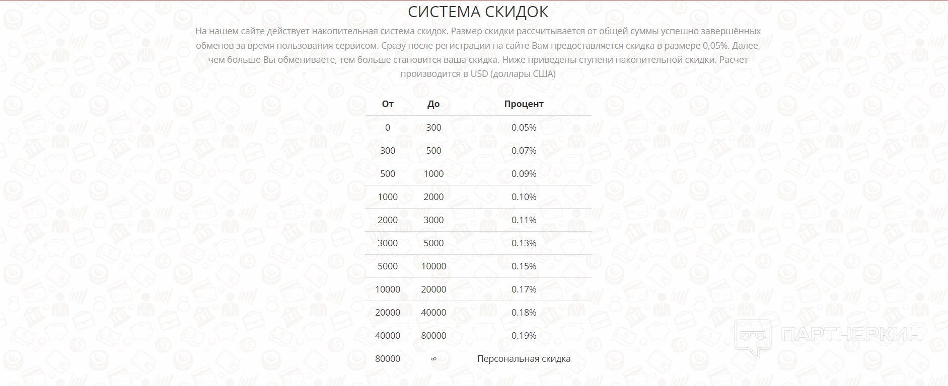 В первой части рассказывается про накопительную систему скидок — она предполагает, что чем больше сумм тратит пользователь на обмены, тем больше ему предоставляется скидок в дальнейшем. Пользователям предоставили таблицу, в которой четко обозначено, какую сумму нужно затратить на обмен, чтобы получить конкретную скидку к курсу.