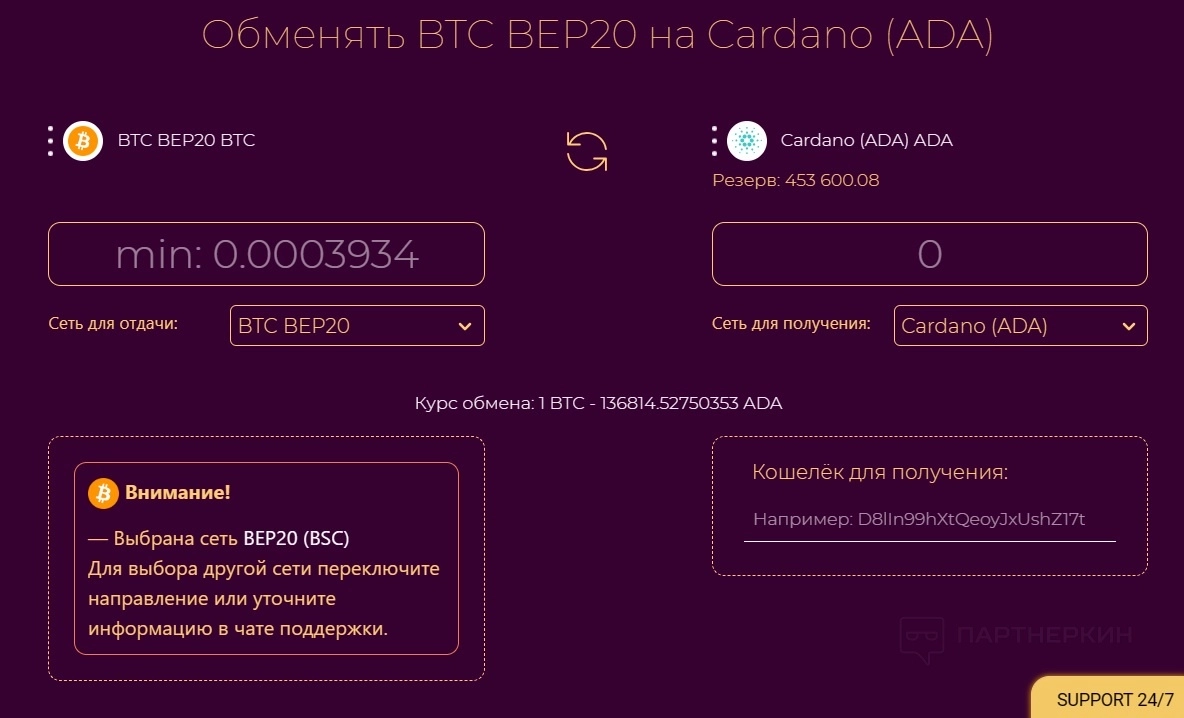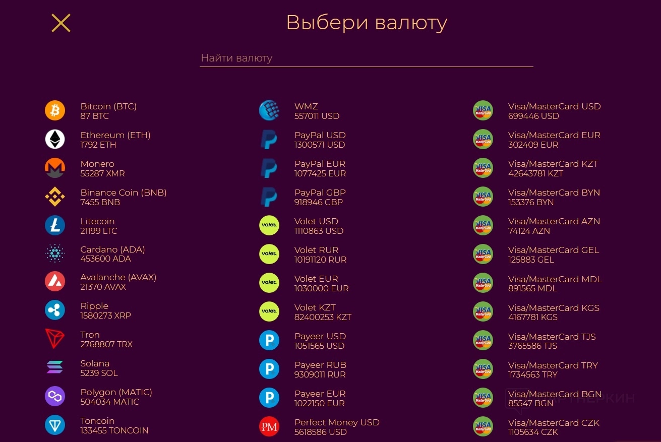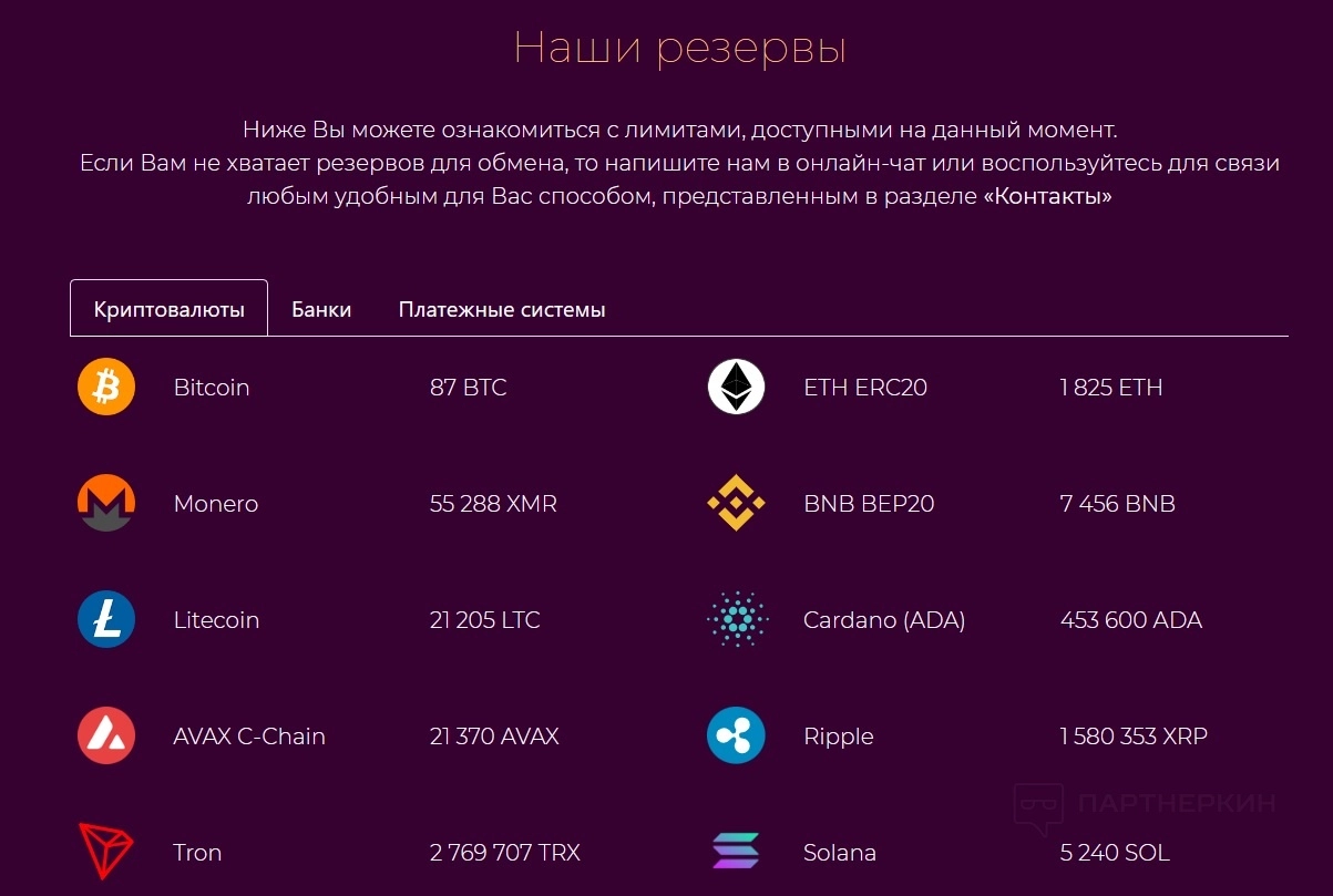 Обменник отличается простым интерфейсом: на главной странице можно увидеть возможные направления обмена, ознакомиться с резервами и курсами. При этом, если пользователю не хватает резервов, он может обратиться в техподдержку для обсуждения, как можно увеличить лимиты.