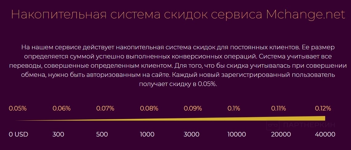 Система учитывает все переводы, совершенные определенным клиентом. Для того, что бы скидка учитывалась при совершении обмена, нужно быть авторизованным на сайте. Каждый новый зарегистрированный пользователь получает скидку в 0,05%. Если пользователь обменивает более $40 000, он получает максимальную скидку 0,12%.