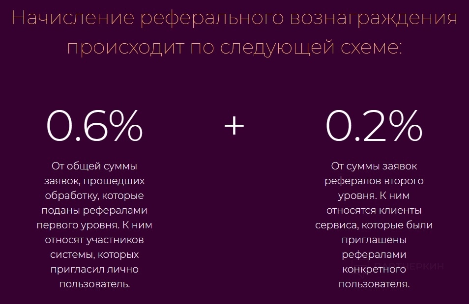 - 0,2% от суммы заявок рефералов второго уровня также начисляется пригласившему. К рефералам второго уровня относятся клиенты сервиса, которые были приглашены рефералами первого уровня пользователя.