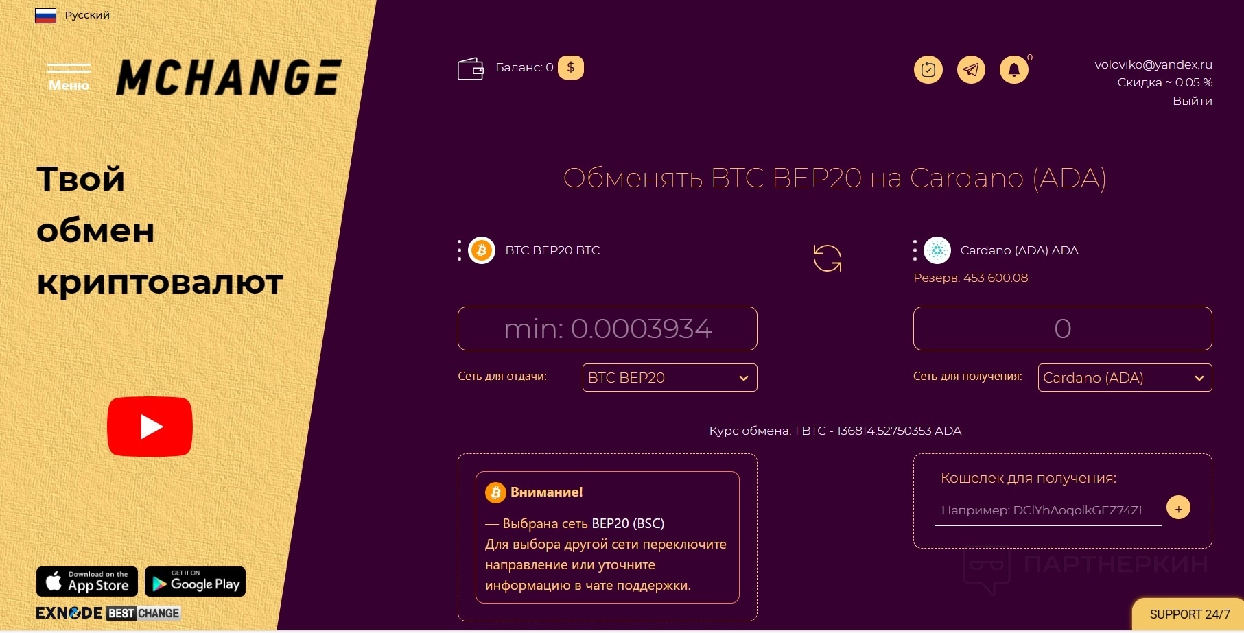 После регистрации можно менять криптовалюту в личном кабинете, а также смотреть статус по заявке и свой баланс.