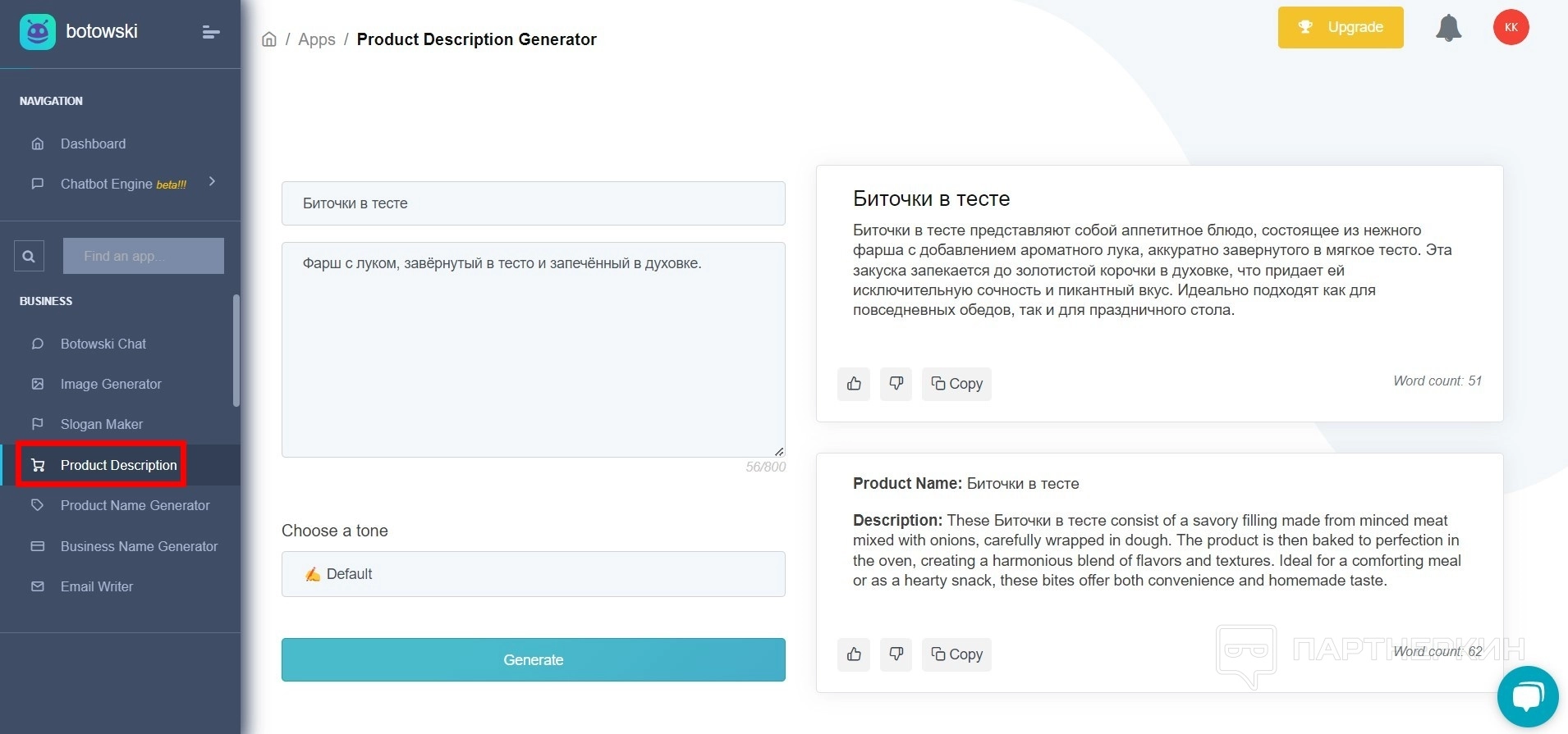 Описание продукта на основе ИИ. Впишите название товара. В нижнее поле впишите, как выглядит данный продукт. Плюс данного инструмента заключается в том, что AI выдает результат на русском. Также бот сразу пишет description на английском. Таким образом продукт можно продвигать на отечественном рынке и в буржунете.