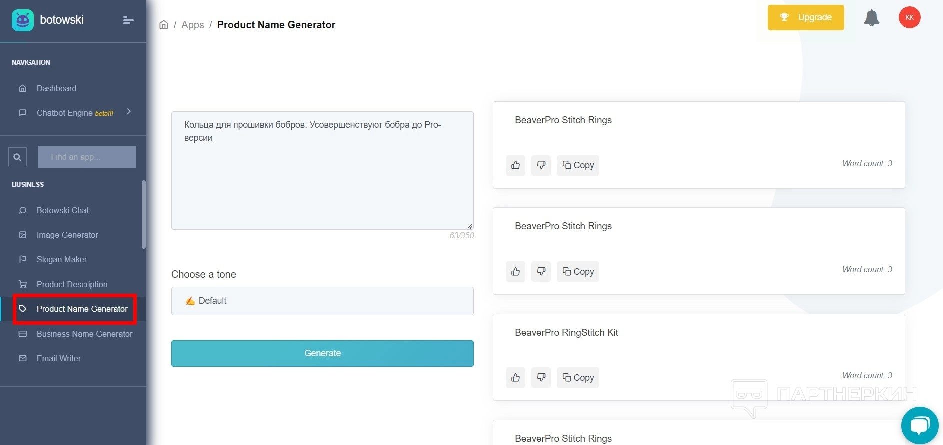 Это генератор названий. Опишите продукт (товар), ИИ сгенерирует несколько вариантов названий. В Pro-версии можно выбирать тон креатива.