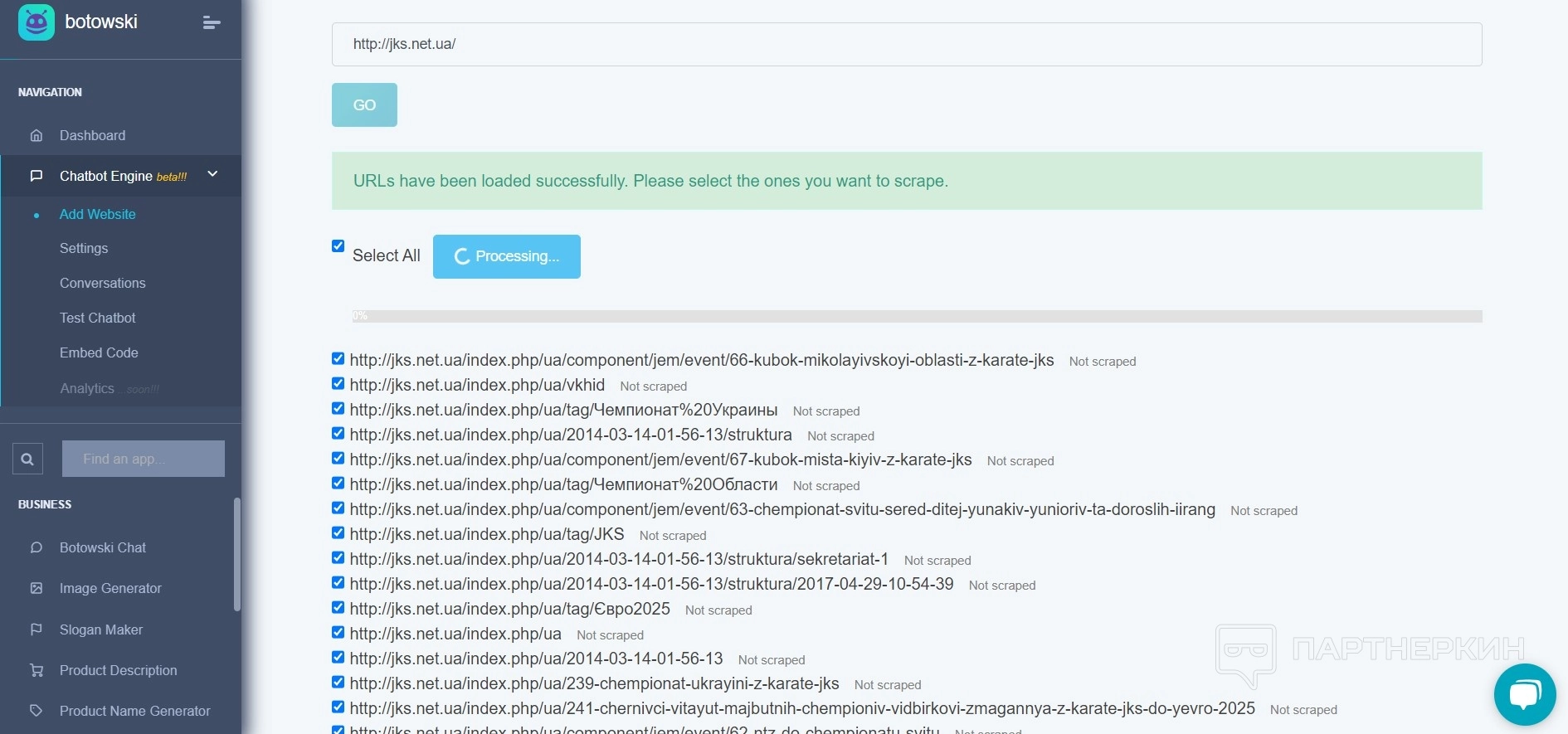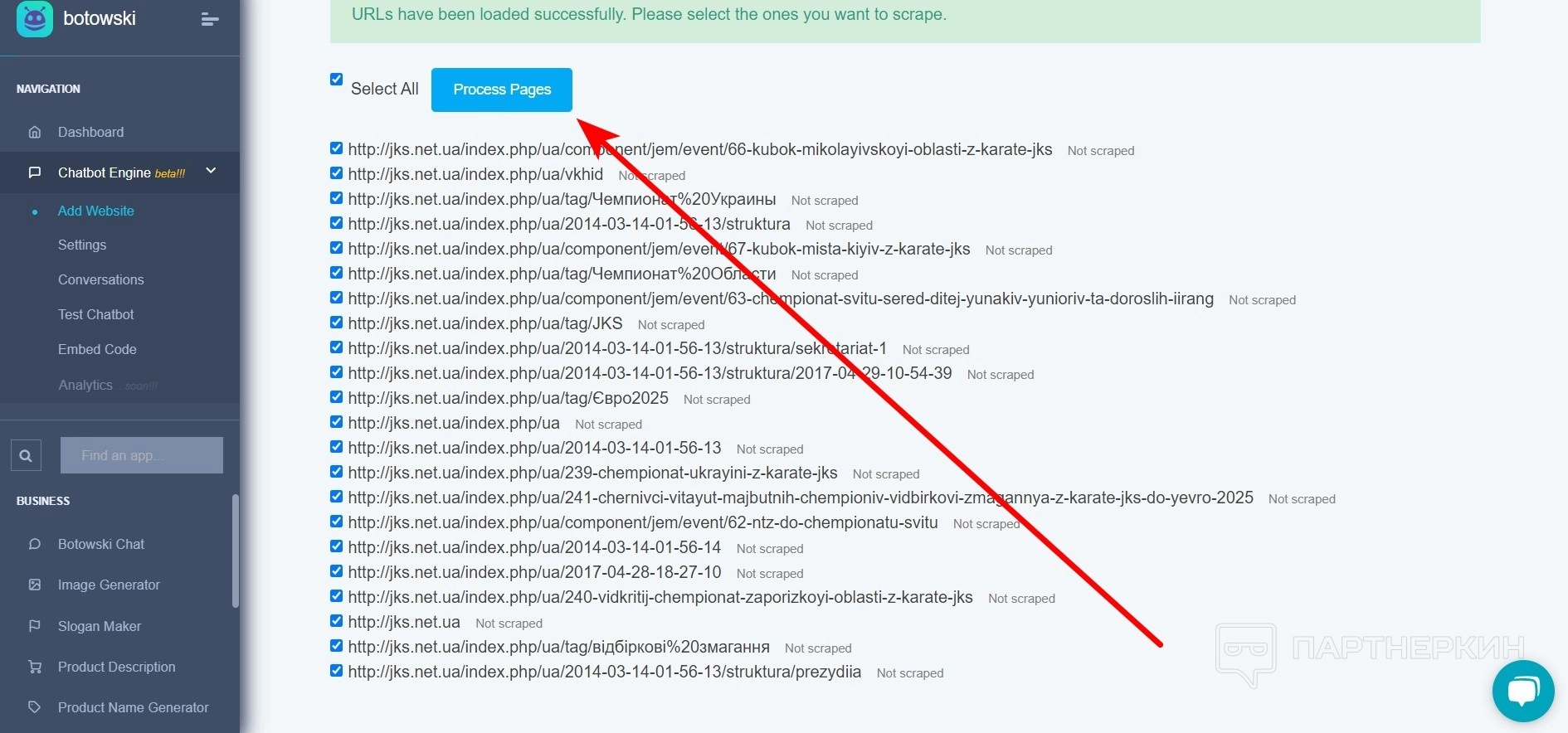 - Система проанализирует сайт и выдаст все связанные страницы. Выберите те, на основе которых хотите создать чат-бота. Нажмите Process Pages .