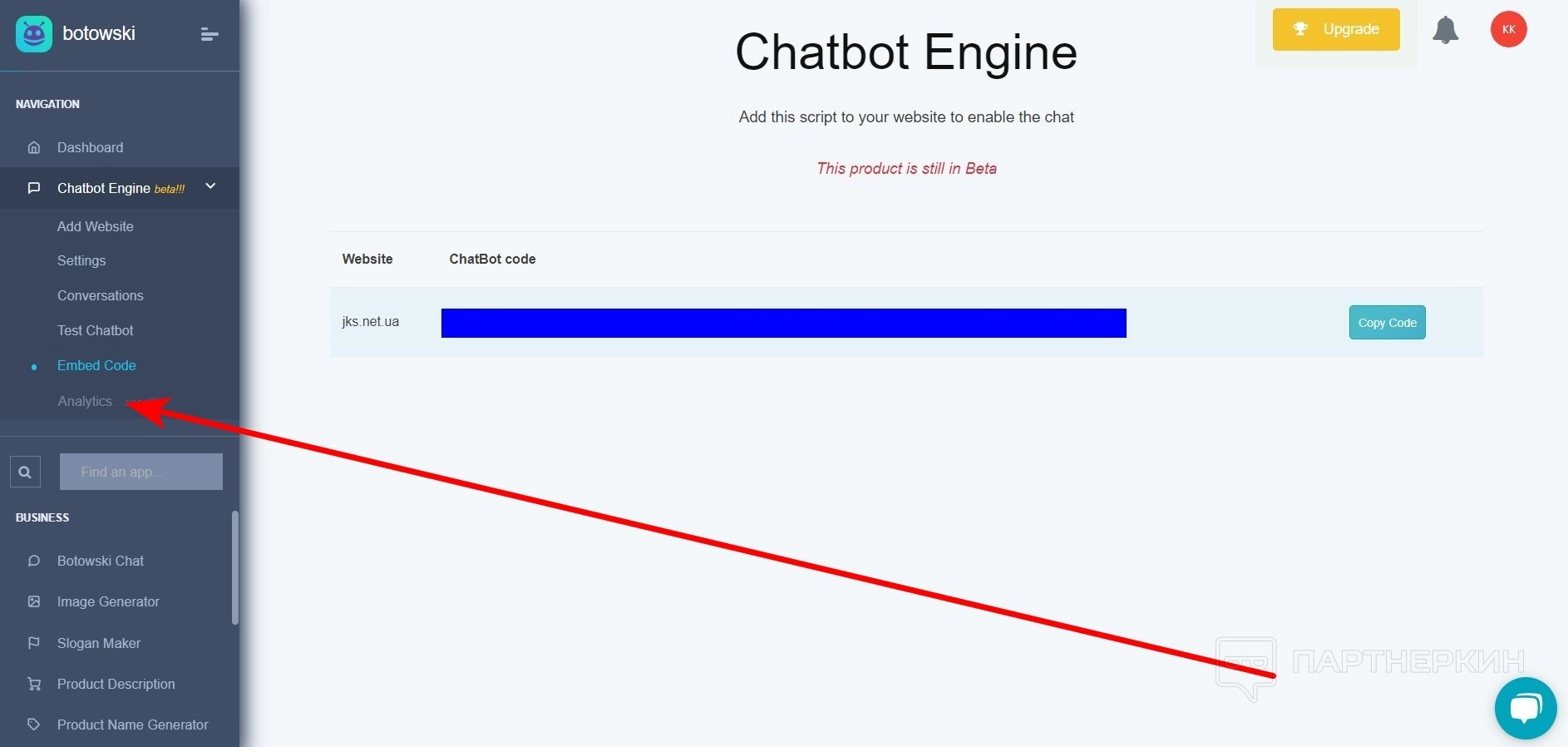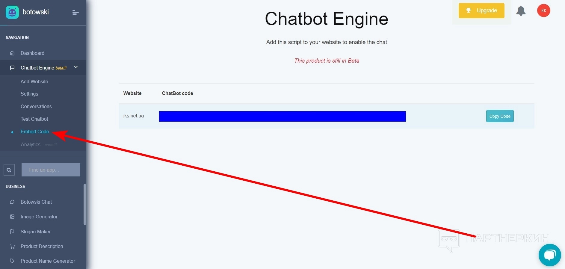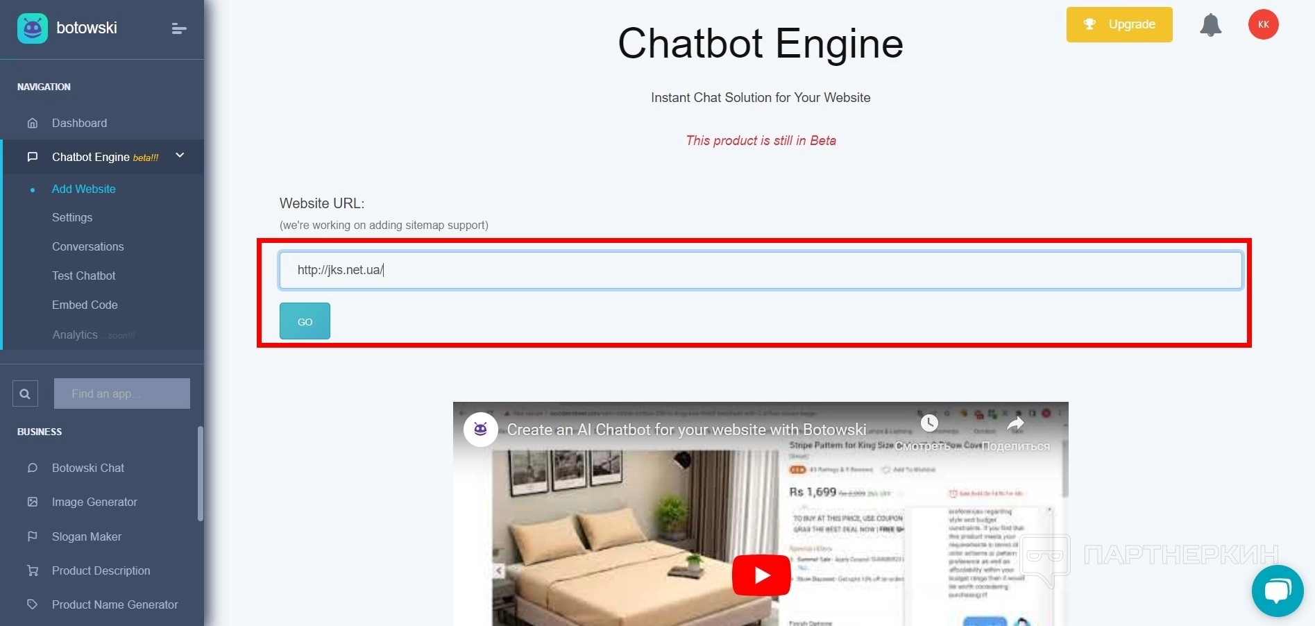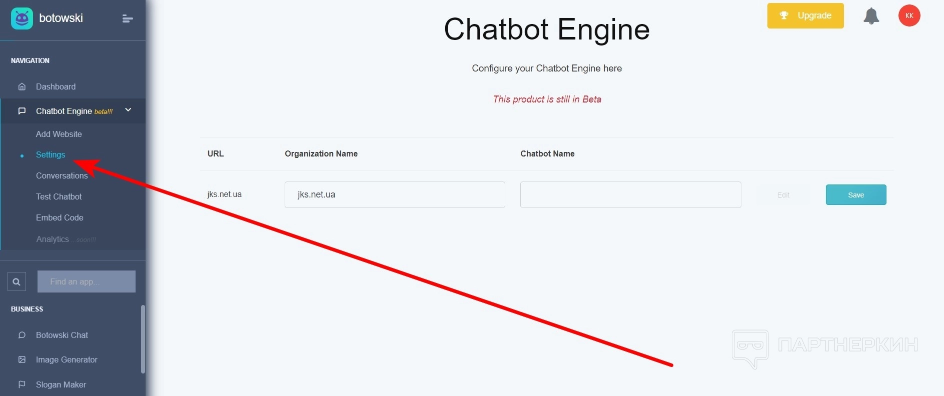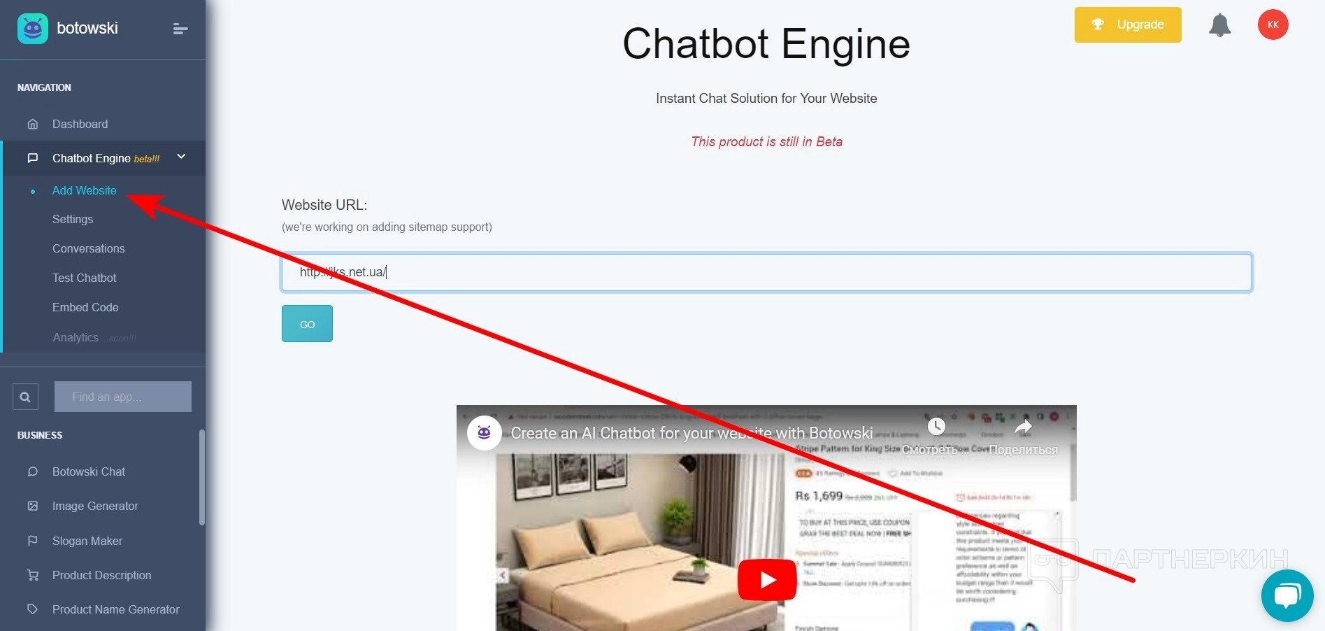 - Во вкладке Chatbot Engine выберите пункт ADD Website .