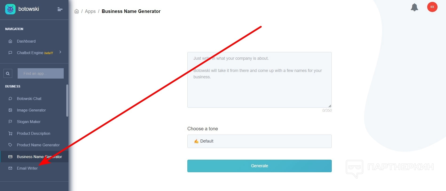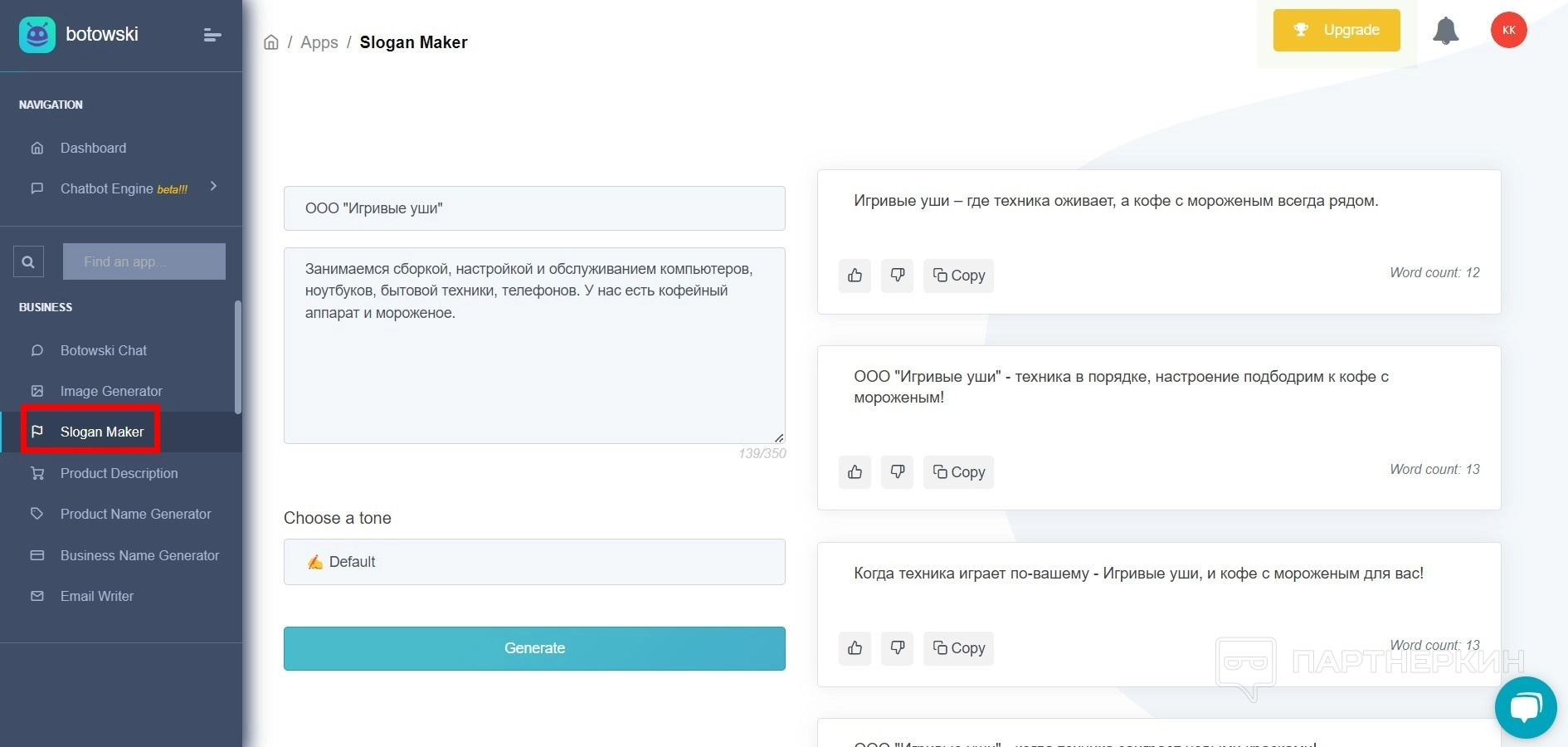 Мощное ПО для генерации слоганов. В верхнее поле впишите название вашей организации. В нижнее — описание вашей деятельности. Нажмите на кнопку Generate , чтобы запустить процесс. ИИ предложит несколько вариантов слогана. Выберите подходящий. В платных тарифных планах есть также выбор тона. То есть на какую эмоцию сделать упор.