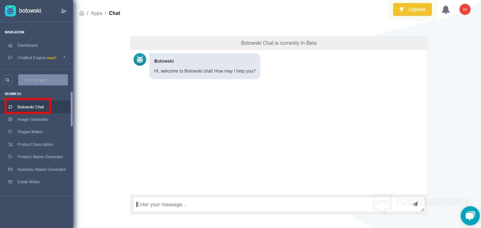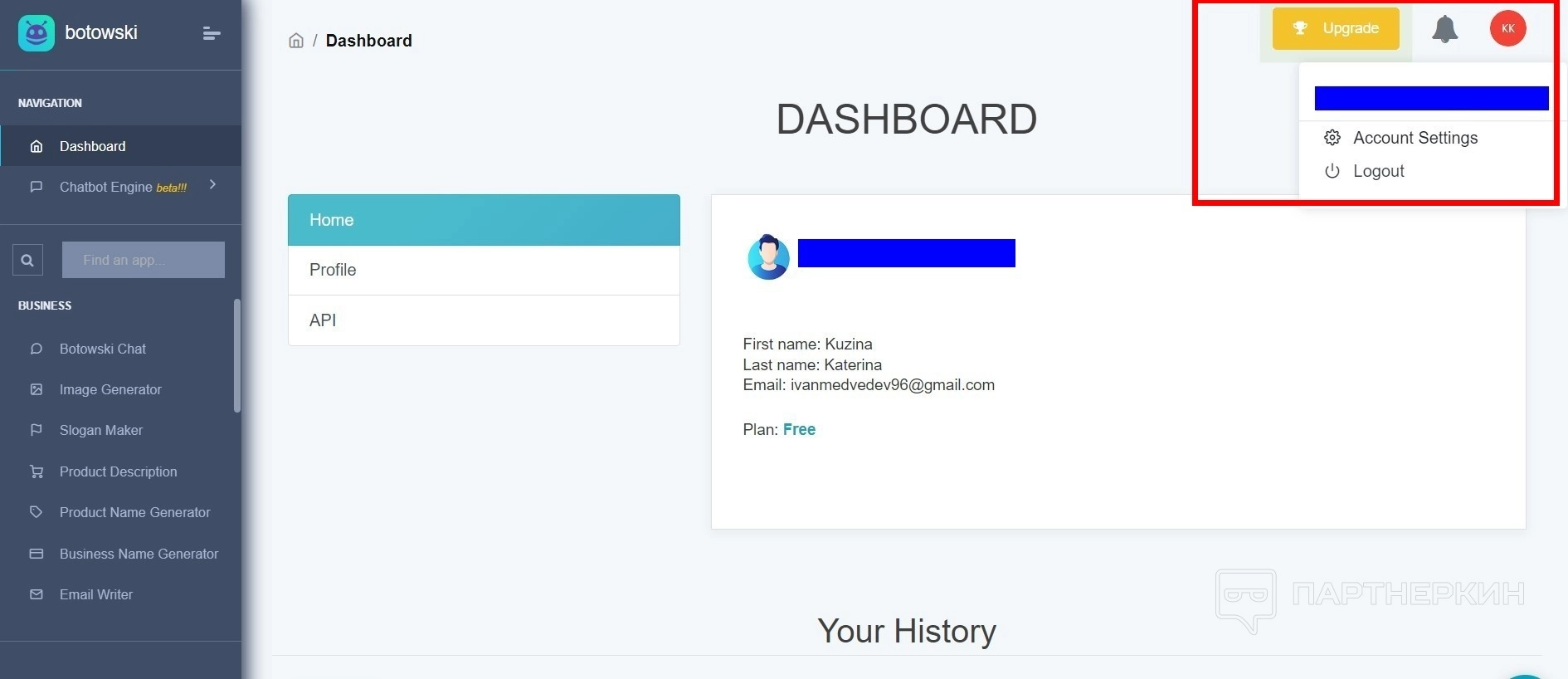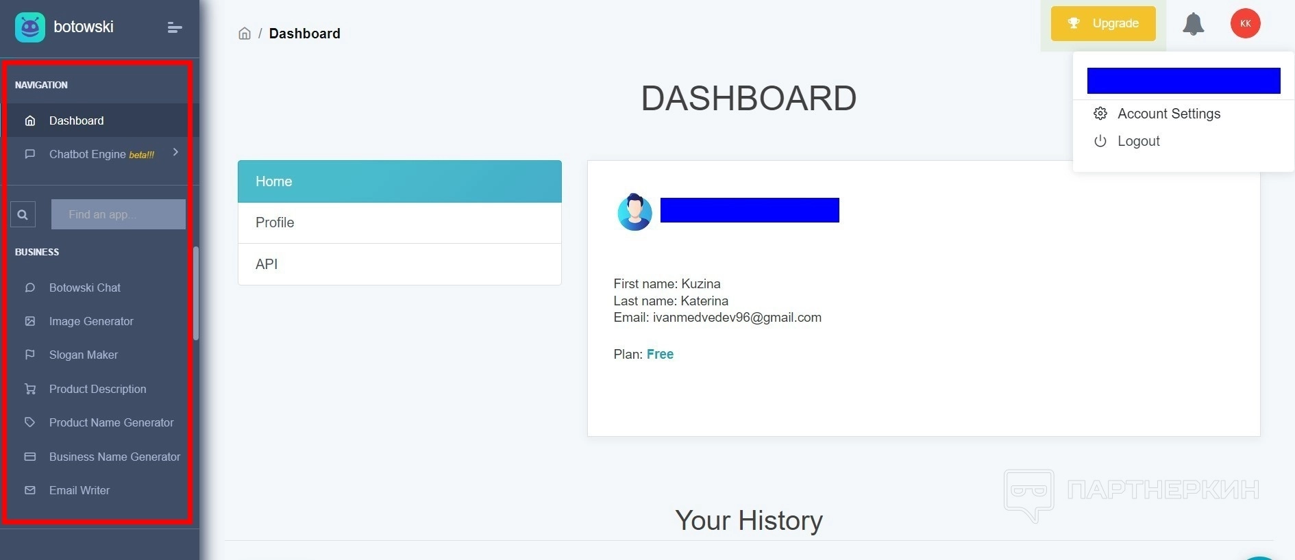 Функционал сервиса выведен в верхнюю часть экрана. Здесь находится доступ к смене тарифного плана (кнопка Upgrade ), уведомления, настройки учетной записи (смена логина, пароля, информация о подписке, подключение к API).