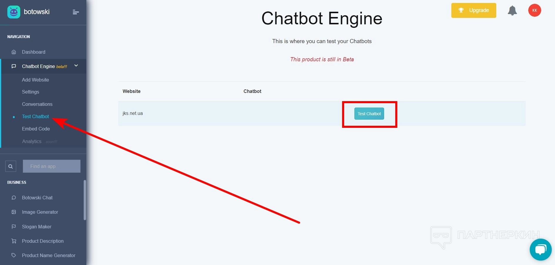 - Test Chatbot. Тестирование чат-бота. Чтобы запустить проверку, нажмите Test Chatbot.