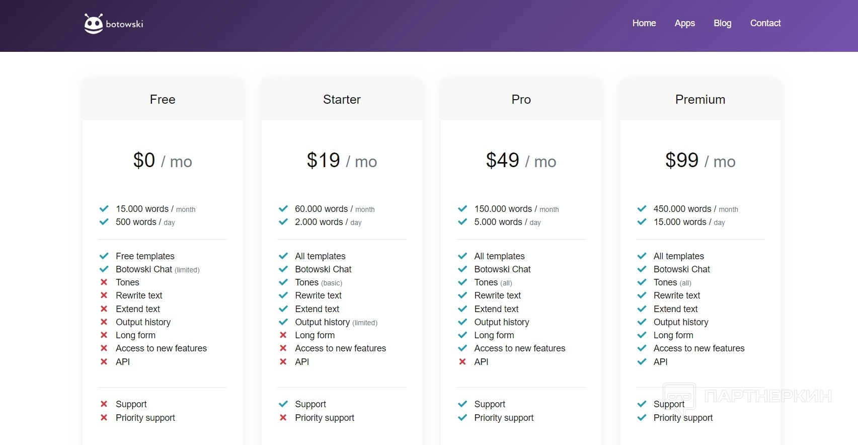 У сервиса есть несколько вариантов подписки. Стоимость влияет на количество слов в день / месяц (запросы), виды инструментов и тип поддержки.