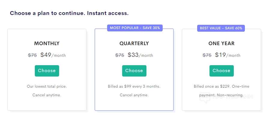 Тариф Pro включает неограниченное количество полных обзоров резюме и профиля LinkedIn*, множество переписываний с помощью искусственного интеллекта, более 100 шаблонов резюме. Стоимость ежемесячной подписки составляет $49, ежеквартальной — $33 ($99 каждые 3 месяца), а годовой — всего $19 в месяц ($229 за год).