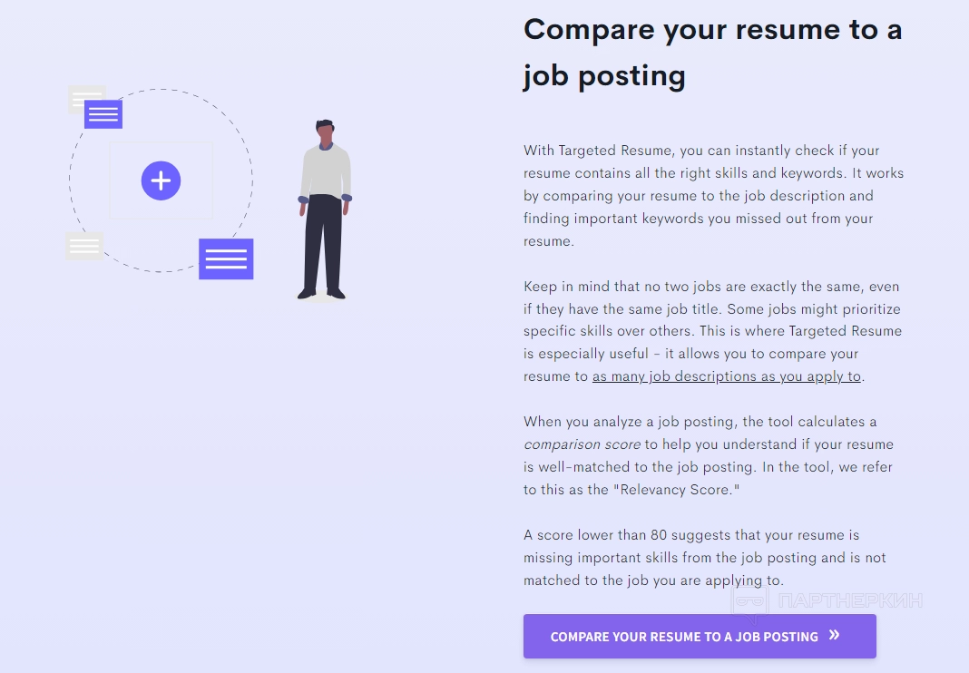 Одним из основных преимуществ использования Targeted Resume является возможность мгновенно сравнить свое резюме с требованиями вакансии. Инструмент вычисляет «балл релевантности», показывающий, насколько резюме соответствует указанным требованиям. Балл ниже 80 указывает на то, что в резюме не хватает ключевых навыков и его нужно доработать.