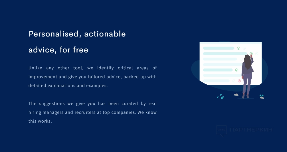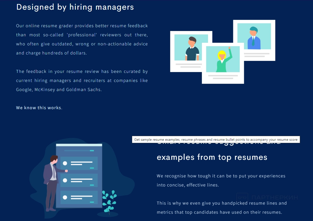 Инструмент выявляет пробелы в резюме и предоставляет подробную оценку с индивидуальными советами по его улучшению. Эти рекомендации основаны на мнениях рекрутеров и примерах успешных кандидатов. Платформа также предлагает переписанные варианты строк, которые можно использовать для улучшения резюме.