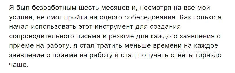 Кроме того, отзывы показывают, что функция полного анализа резюме помогает пользователям увидеть свои слабые места и улучшить их.