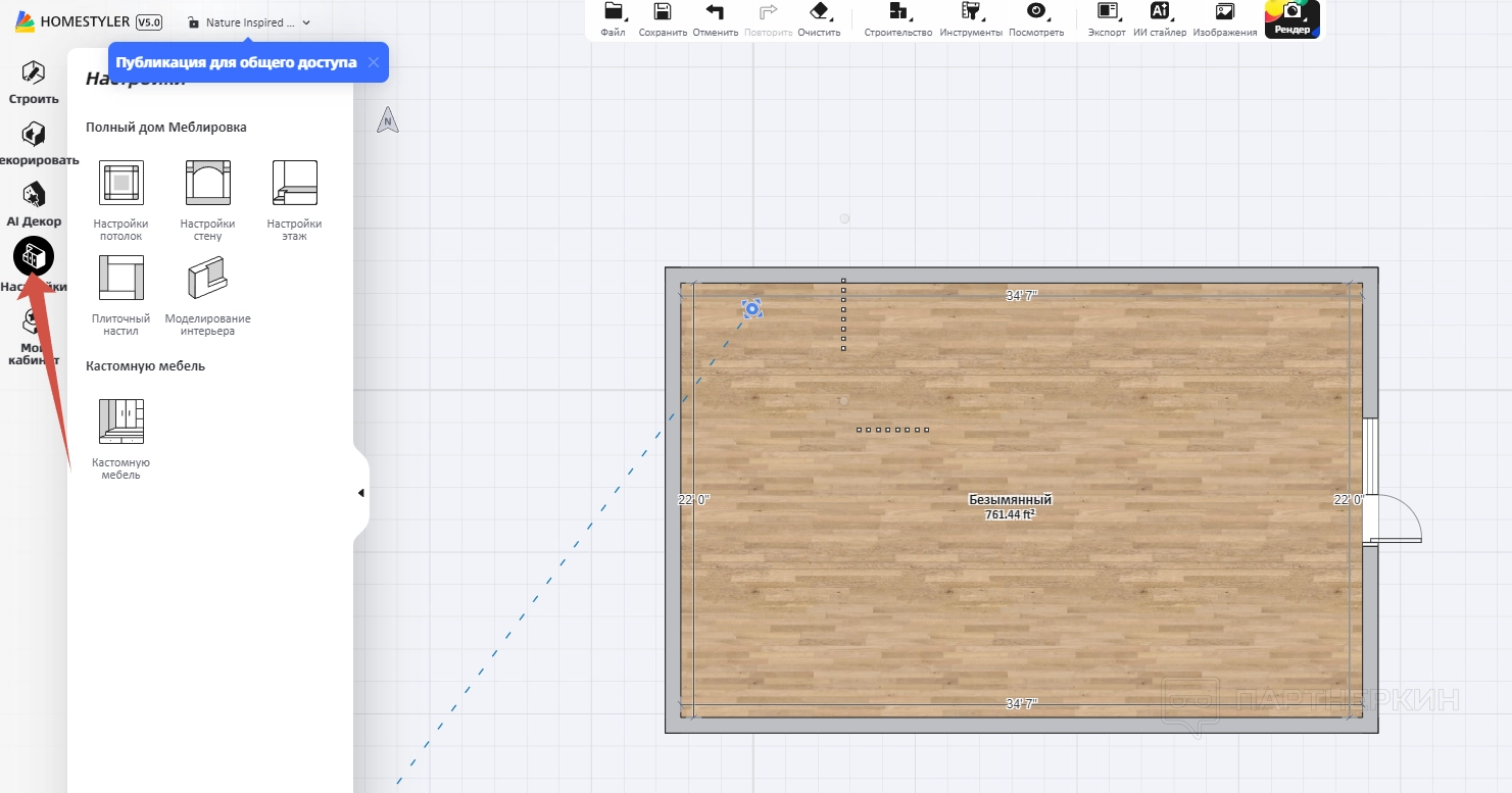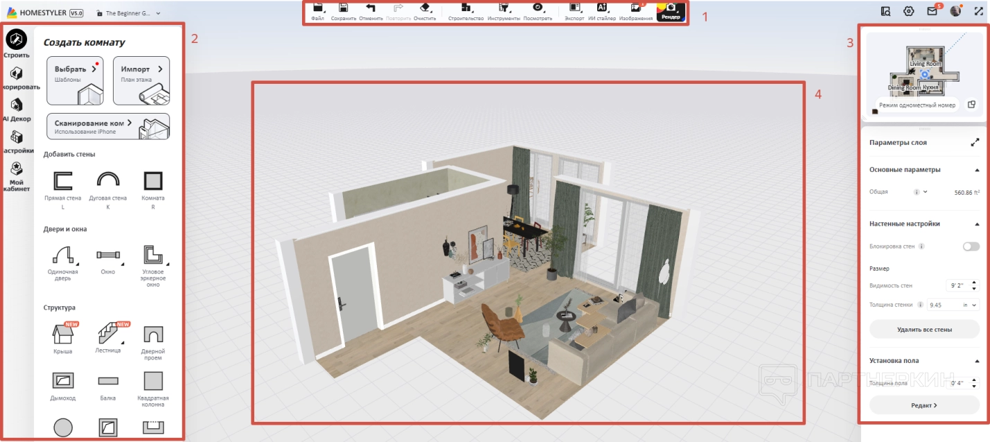 - Редактор материалов. Возможность выбора и настройки различных материалов и текстур для пола, стен и мебели.