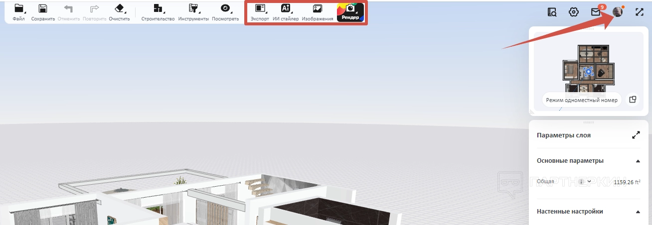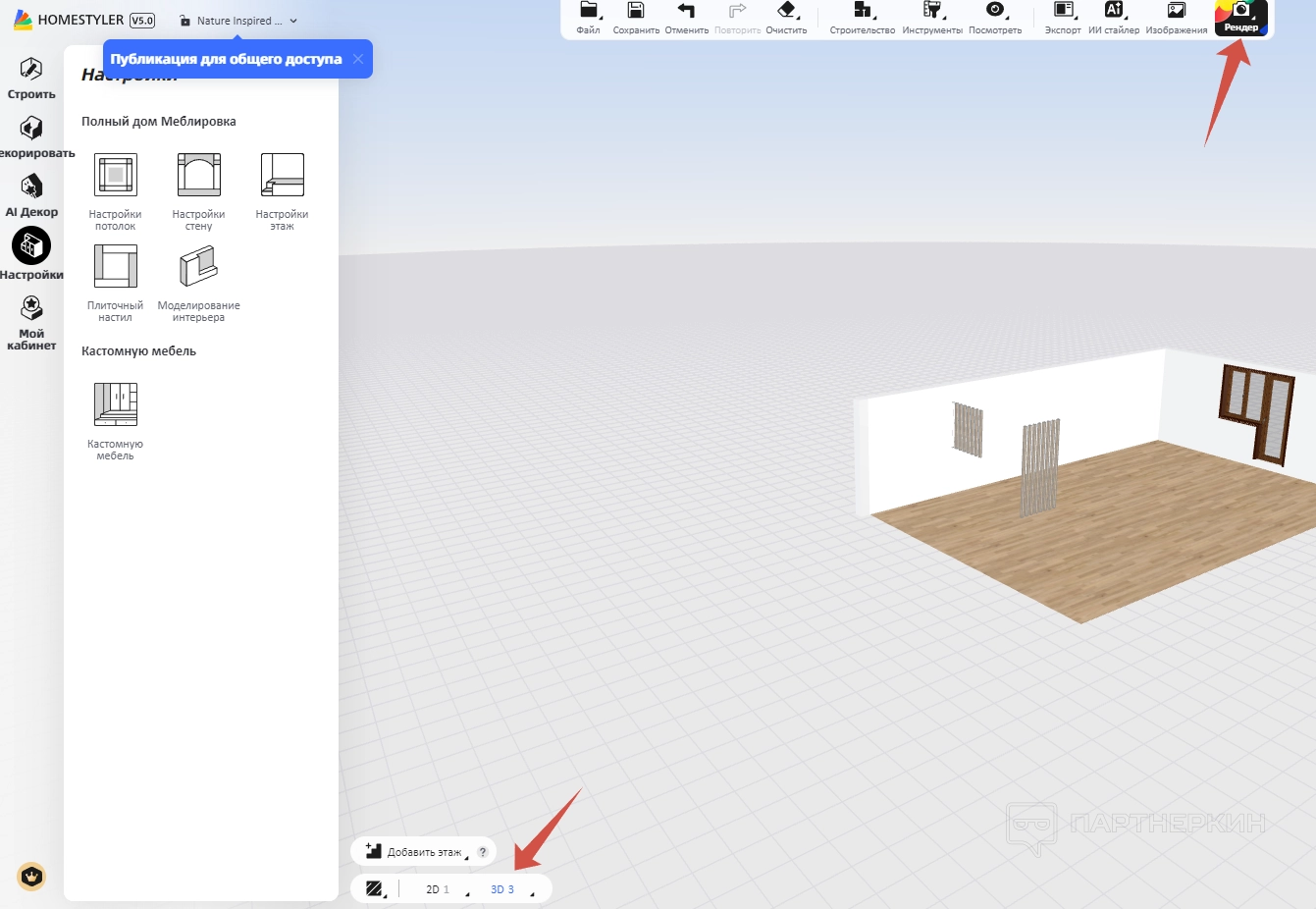 Чтобы сохранить модель, достаточно кликнуть на «Рендер» и выбрать подходящий формат. Перед этим можно посмотреть на проект в трехмерном режиме. Просто кликните на 3D в нижней части экрана.