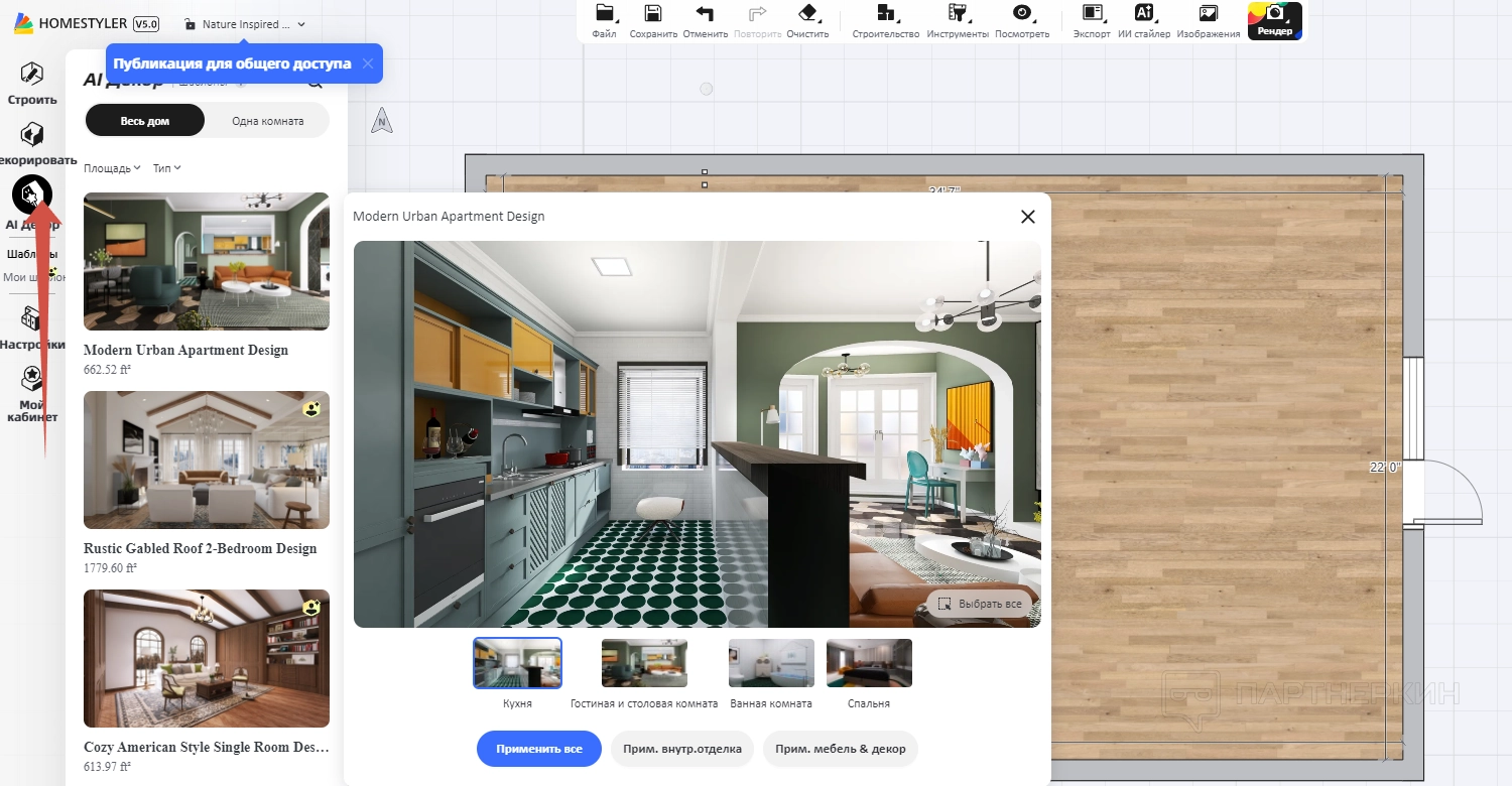 Следующий раздел – «ИИ декор». Здесь вы можете найти библиотеку шаблонов на базе искусственного интеллекта, которые можно примерять для любого помещения. Есть фильтр разделяющий декор по следующим параметрам: