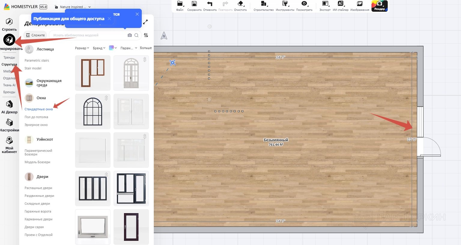 Переходим в категорию «Структура» и выбираем любое «Стандартное окно». Перетаскиваем его к правой стене.