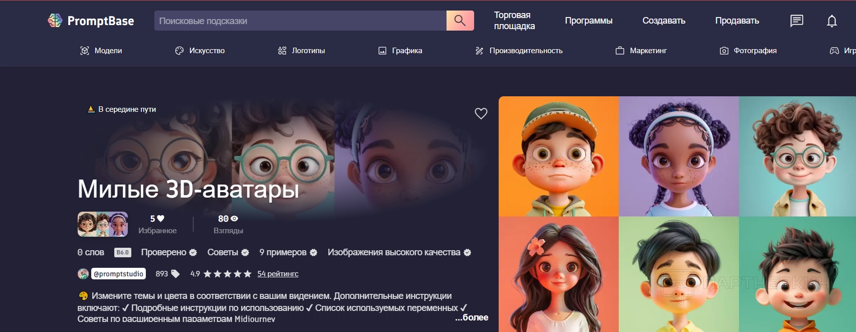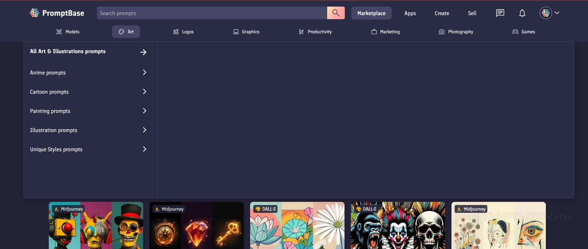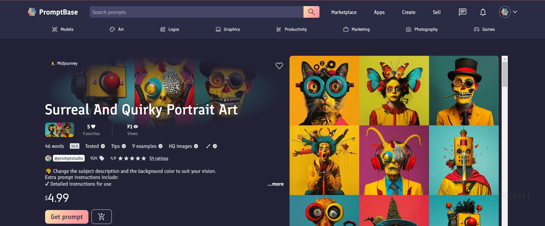Например, стоимость набора промптов для генерации сюрреалистичных персонажей в Midjourney составляет 4,99 USD.