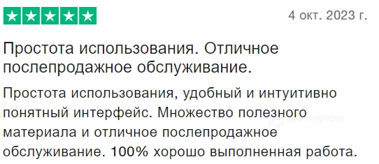 Пользователи подчеркивают удобство использования платформы и ее понятный интерфейс. Они также ценят обилие полезных материалов и отличное послепродажное обслуживание и считают работу сервиса качественно выполненной на 100%, благодаря большому количеству полезных ресурсов и отличному обслуживанию после покупки.