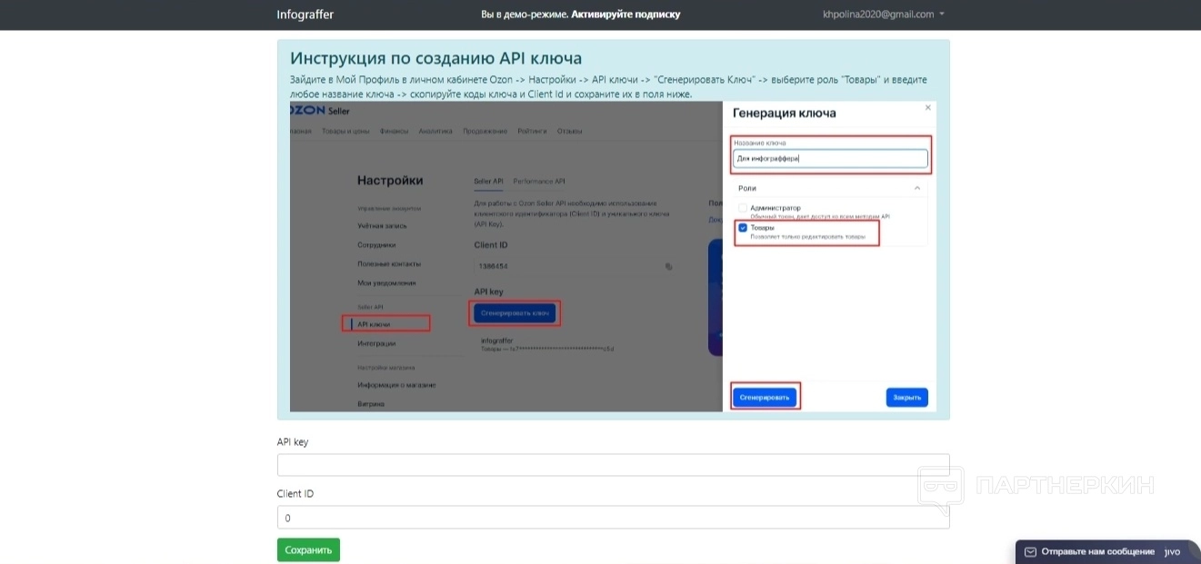 Там же находятся два раздела, предназначенные для интеграции с маркетплейсами Wildberries и Ozon. Достаточно следовать подсказкам от создателей и подключение к личному кабинету по API-ключу пройдет за считанные минуты.
