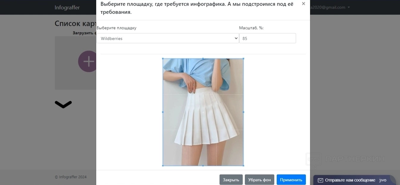 Шаг 1. На главной странице личного кабинета нажимаем кнопку Загрузить фото, после чего выбираем нужную заготовку. После этого выбираем площадку и настраиваем масштаб будущего изображения. Если подключена платная подписка, то на данном этапе доступно удаление фона с изображения.