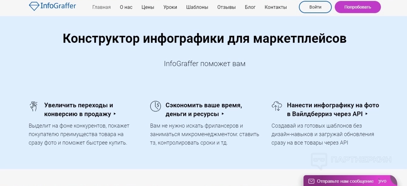 Вся созданная инфографика сохраняется в личном кабинете до ручного удаления, поэтому в любой момент можно вернуться к редактированию или изменить уже существующие файлы. Благодаря наличию встроенного API владелец учетной записи в InfoGraffer может за считанные секунды загрузить готовые фотографии в карточки товаров на маркетплейсах.