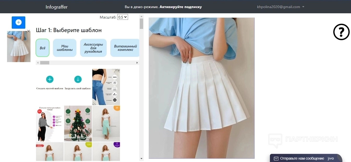 Шаг 2 . Следующий этап — настройка шаблона. В открывшемся окне пользователь может либо создать или загрузить собственный (доступно на платном тарифе), либо использовать готовый от дизайнеров. Большинство заготовок распределены по категориям товаров, что значительно упрощает и ускоряет процесс выбора подходящего оформления.