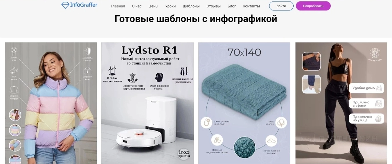 Даже незарегистрированным пользователям для ознакомления доступна галерея инфографики, в которой собраны популярные и часто используемые примеры стилей и оформление карточек товаров. Разработчики платформы взяли на себя одну из главных задач — предварительный анализ всех категорий товаров, часто применяемых параметров и выделение наиболее продаваемых фотографий. На основе полученных данных и создается библиотека, благодаря которой владельцы бизнеса могут не заниматься аналитикой, а посвятить время другим важным задачам.