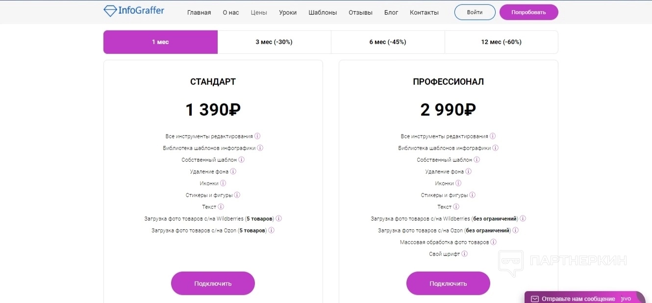 Что касается доступа к возможностям платформы и оплаты, то у InfoGraffer существует два типа подписки и бесплатный ограниченный доступ к функционалу конструктора. Клиенты могут оформить выбранный тарифный план сроком на 1, 3, 6 и 12 месяцев.