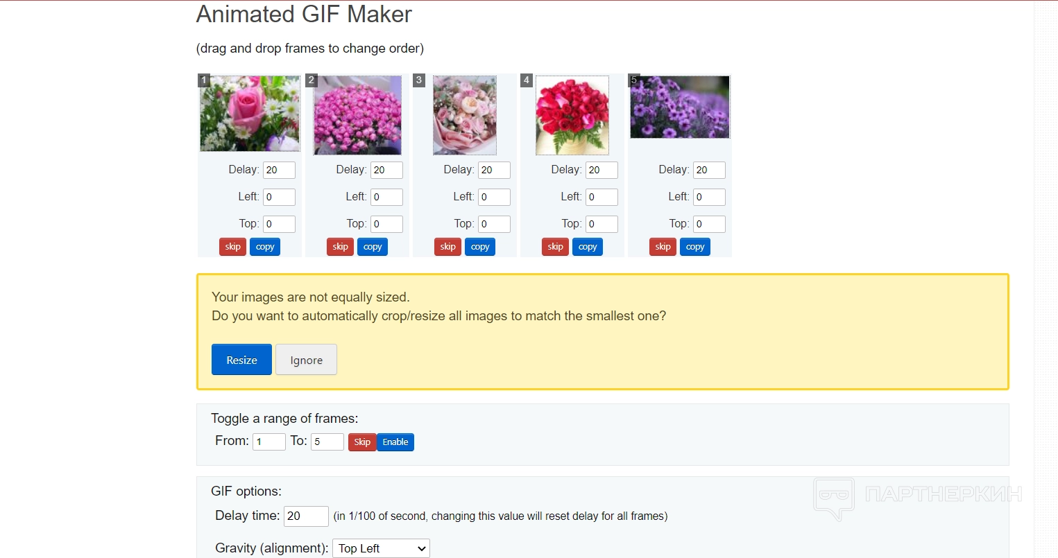 Если картинки разного размера, редактор предложит их обрезать для удобства — это происходит автоматически. В настройках после обрезки нужно под каждой картинкой указать то количество секунд, на которое они будут задерживаться. Также можно задать количество циклов анимации гифки, диапазон кадров и то, как сменяются картинки.