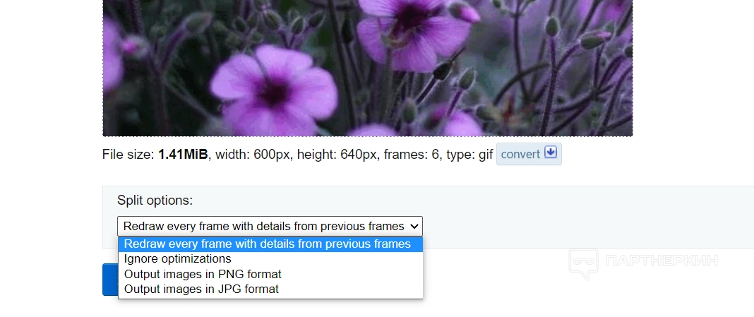 Split. С помощью функции можно разрезать гифку на отдельные кадры — в настройках можно указать, в каком формате изображения будут на выходе. Например, JPG или PNG.