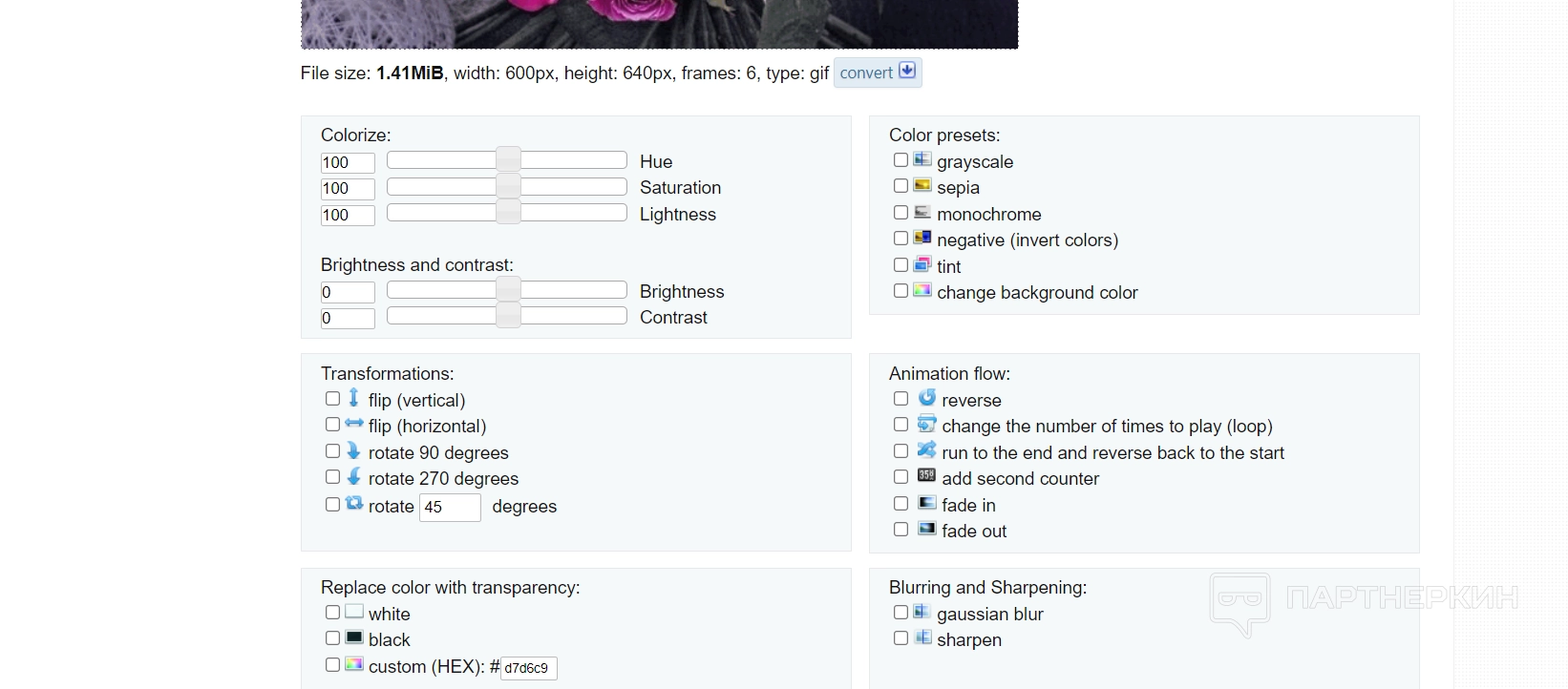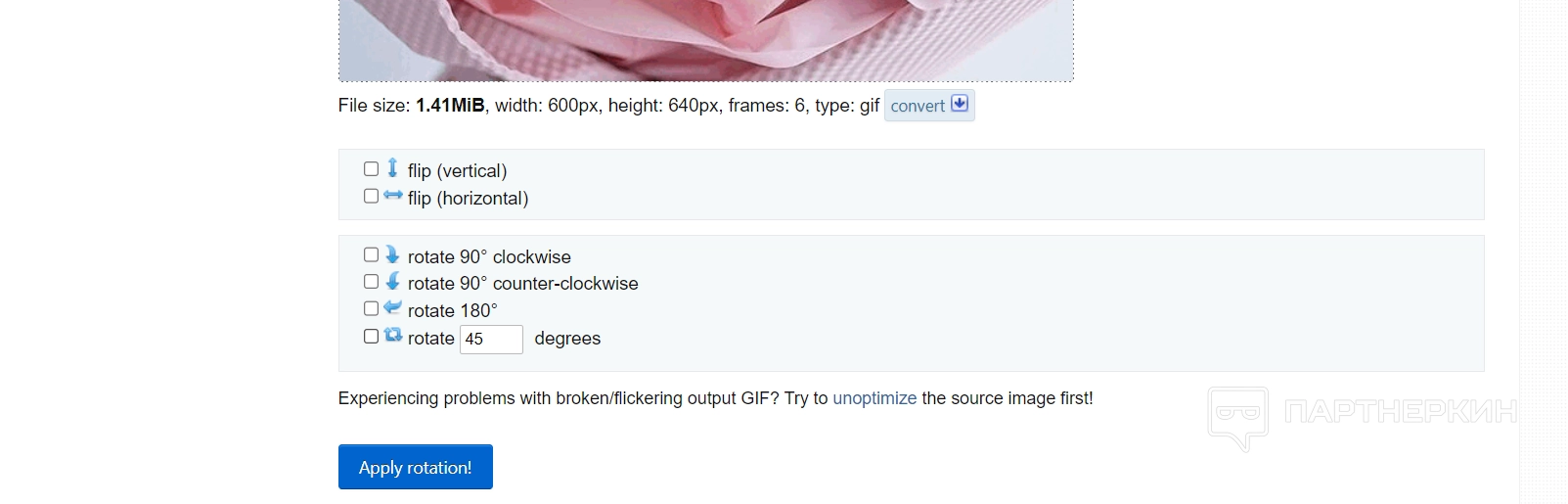 Rotate. В этом разделе можно развернуть картинку или гифку.