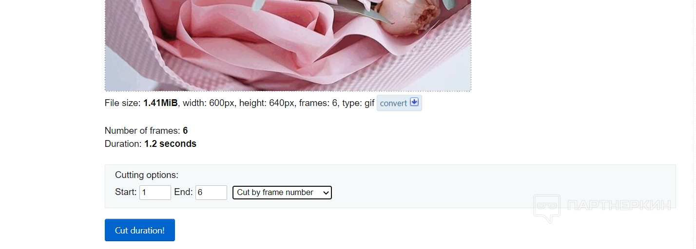 Cut. С помощью этого инструмента можно сократить длительность гифки. В настройках нужно отметить момент начала и конца того отрезка, который нужно обрезать. Указываются значения как в кадрах, так и в секундах.