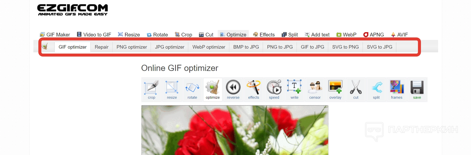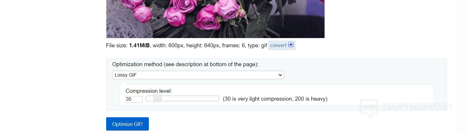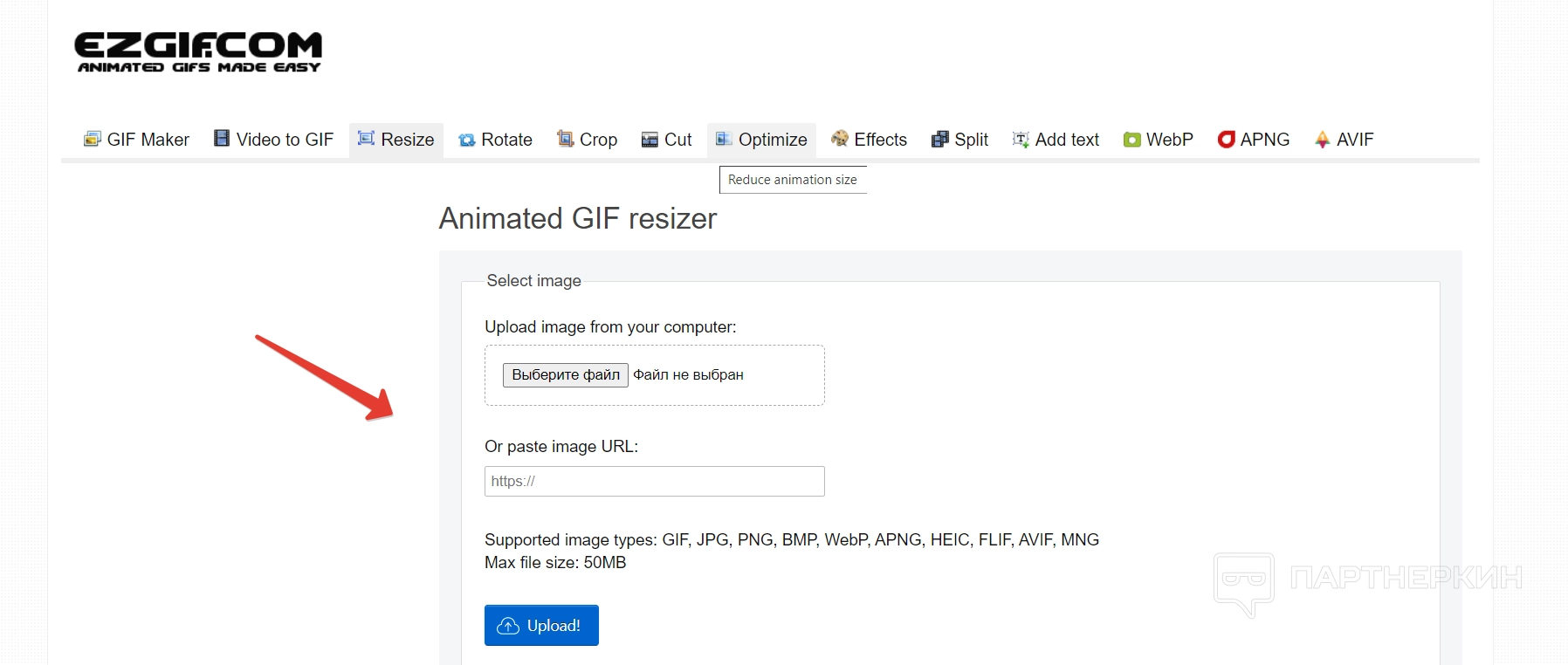 В этом разделе можно оптимизировать только гифки, поэтому появляется дополнительное меню с функциями оптимизации для разных форматов фото.