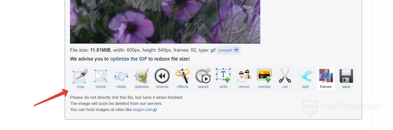 Crop. Функция обрезки помогает значительно уменьшить размер гифок — это актуально, когда тяжелые гифки нагружают сайт, например, и плохо прогружаются.