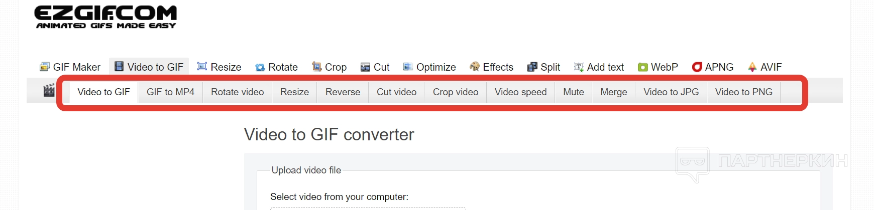 При работе с видео появляется дополнительная панель с функциями — преобразование гифки в видео, разворот видео, обрезка, обратная съемка. Поэтому можно редактировать не только гифки, но и видеоролики по необходимости.