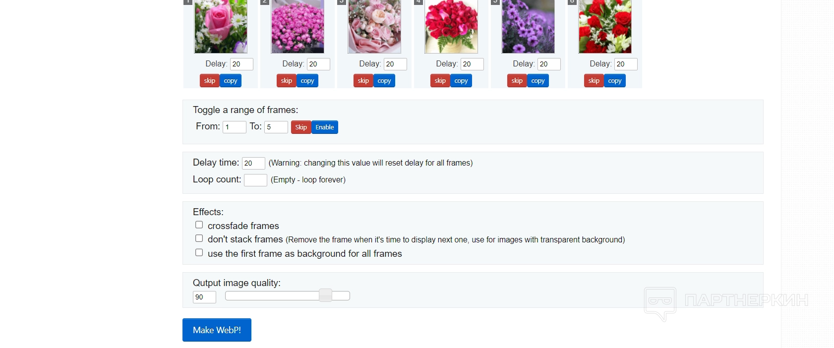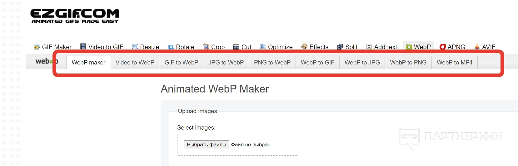 WebP, APNG и AVIF. Эти три разных раздела с одинаковыми функциями — здесь можно сделать из изображений гифку в формате WebP, APNG или AVIF. Настройки идентичны тем, что были при создании обычных гифок.