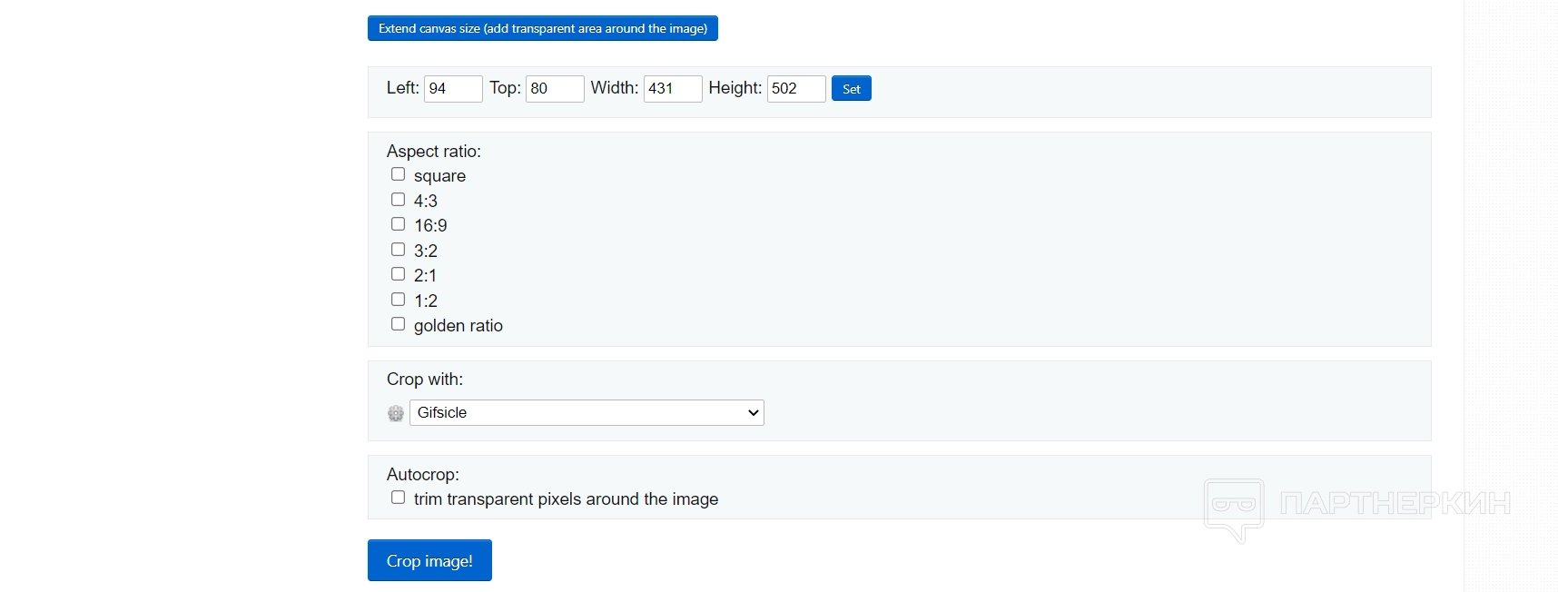 Настроить обрезку можно автоматически и вручную. Вручную для этого придется использовать статичный инструмент обрезки картинок: