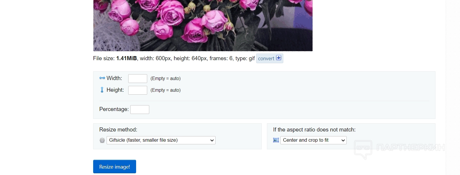 Resize. Инструмент помогает изменять размер гифок, но он также может изменить размер картинок разных форматов — JPG, PNG, WebP, например.